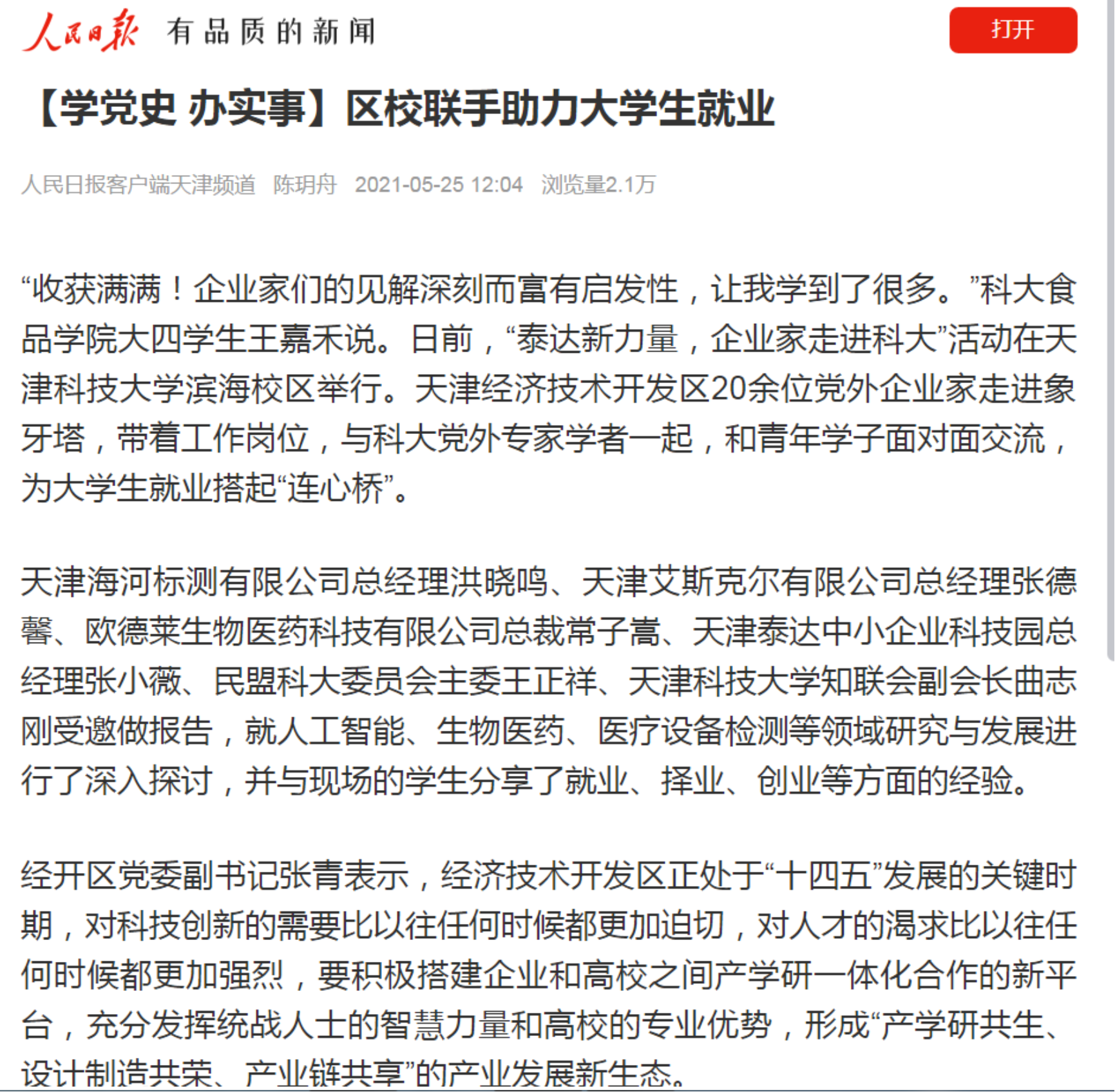 此次活动是经开区与天津科大统战部门落实党史学习教育的相关工作部署,以实际行动推动“我为群众办实事”。通过搭建校企合作平台、校地合作平台,将有力推进大学毕业生就业工作。