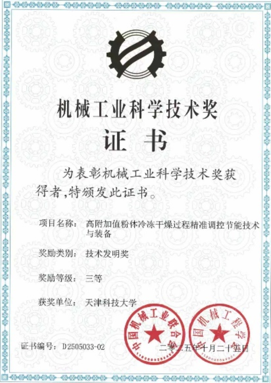 2025年10月,我校校友、河套学院张帆副教授与我校徐庆教授合作开展的“高附加值粉体冷冻干燥精准调控节能技术与装备”项目顺利结题。该项目成功研制出系列液态食品高效冻干装备,在提升产品品质的同时实现高效节能,为液态食品高值化转化提供了关键技术支撑,荣获由中国机械工业联合会、中国机械工程学会联合颁发的“机械工业科学技术奖”技术发明三等奖。