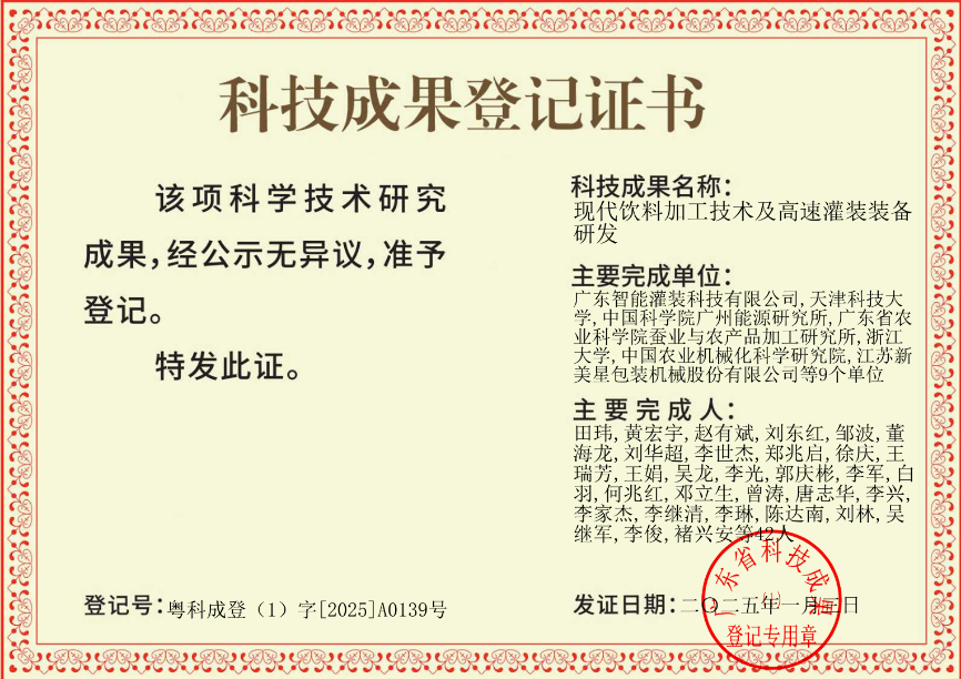 2025年1月,由田玮教授牵头,广东智能灌装科技有限公司、天津科技大学、中国科学院广州能源所等单位共同完成的广东省重点研发计划项目“现代饮料加工技术及高速灌装装备研发”完成科技成果登记。项目研发了饮料及包材高效消毒灭菌技术,开展了广东特色饮品加工工艺适配性开发,研制的高速无菌旋转式吹灌旋包装装备打破了国外技术垄断。