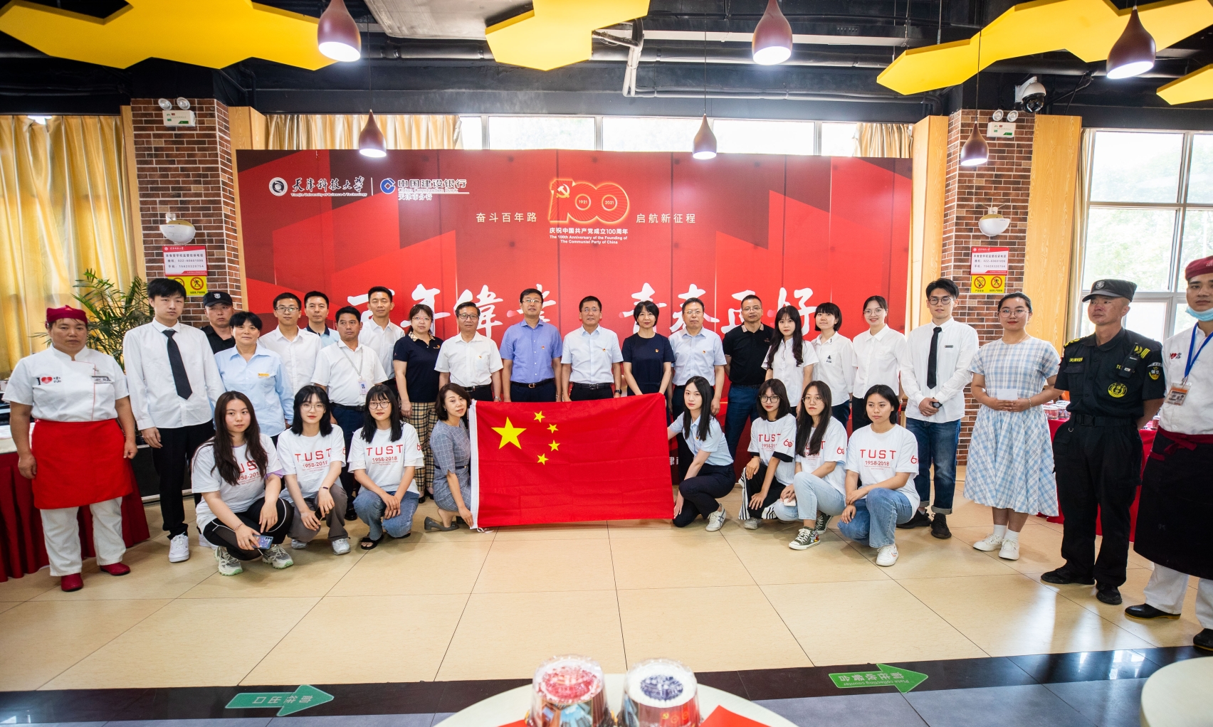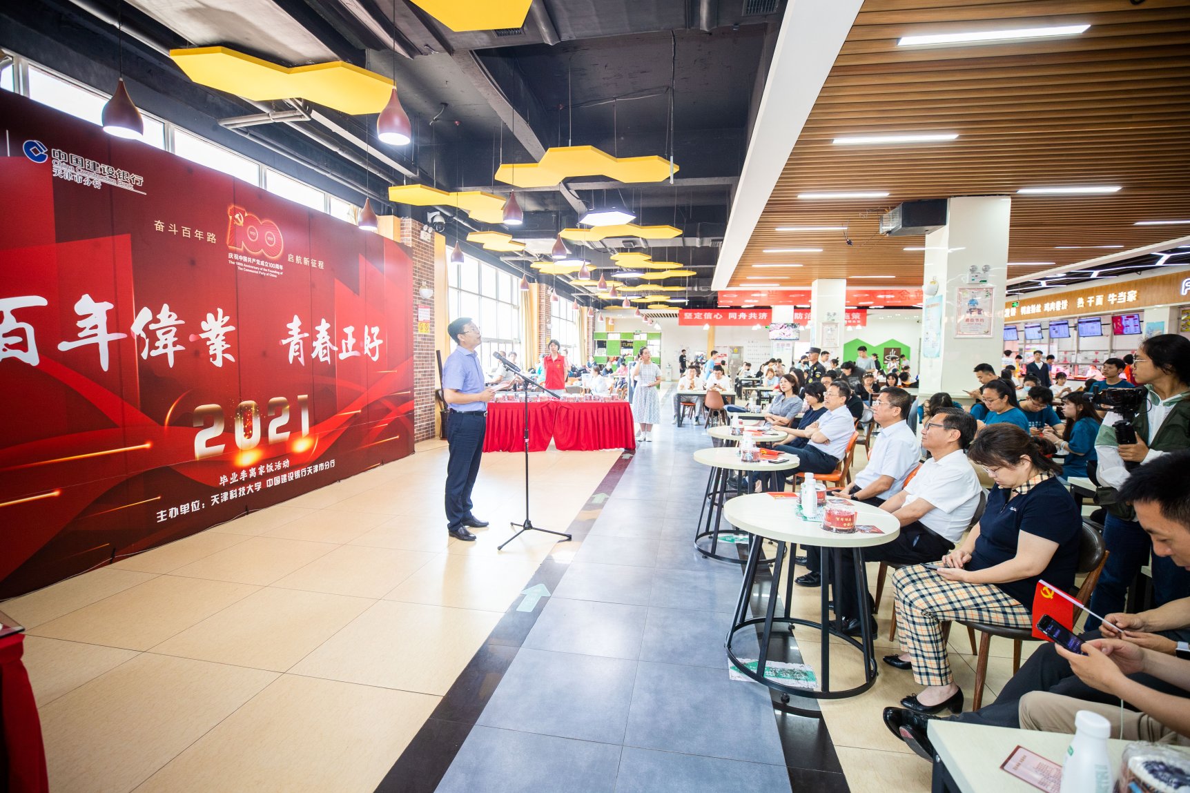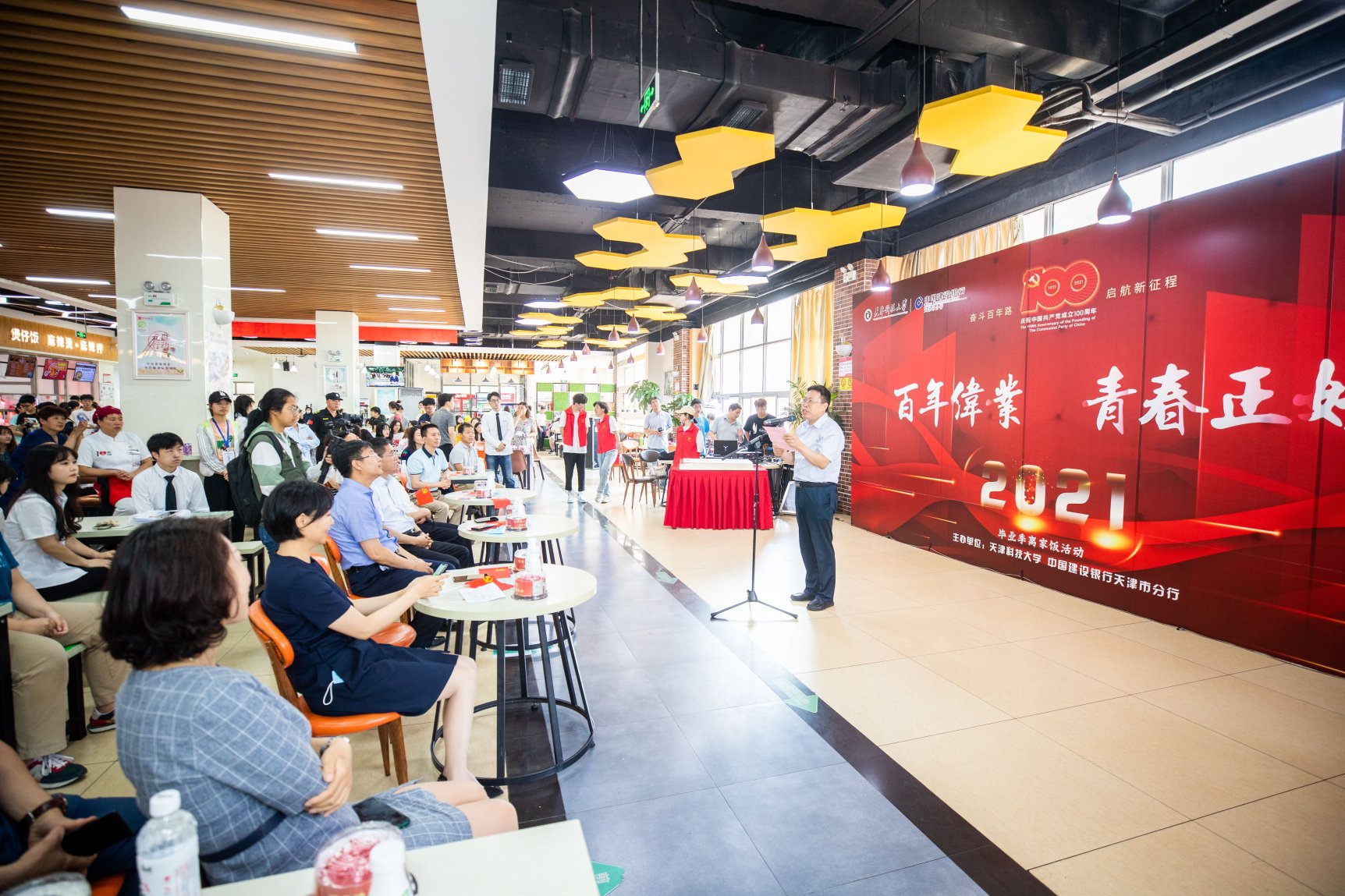 6月21日中午,我校顺利开展“百年伟业 青春正好”2021届毕业季离家饭活动。这是继2019年天津史上最大规模的"散伙饭"顺利举办以后,我校延续往年传统,向全校6213名毕业生每人赠送一个毕业蛋糕,并努力打造的红色毕业季。我校党委书记韩金玉,党委副书记、校长路福平,党委常委、副校长安玉健,中国建设银行天津市分行党委委员、副行长石毅超,中国建设银行天津市分行机构业务部总经理李盈,中国建设银行天津和平支行党委书记、行长张弭出席了此次活动。校党委(校长)办公室、校友办、研工部、学工部、校团委、学生就业指导中心、后勤管理处、安全工作部负责人,各学院师生代表参加活动。