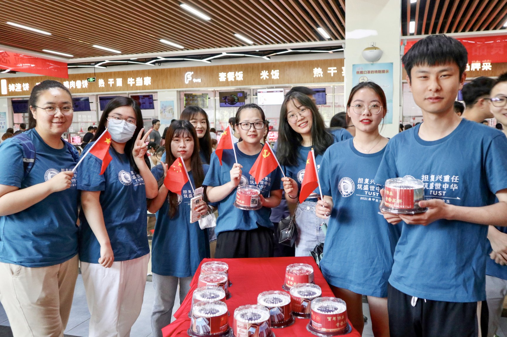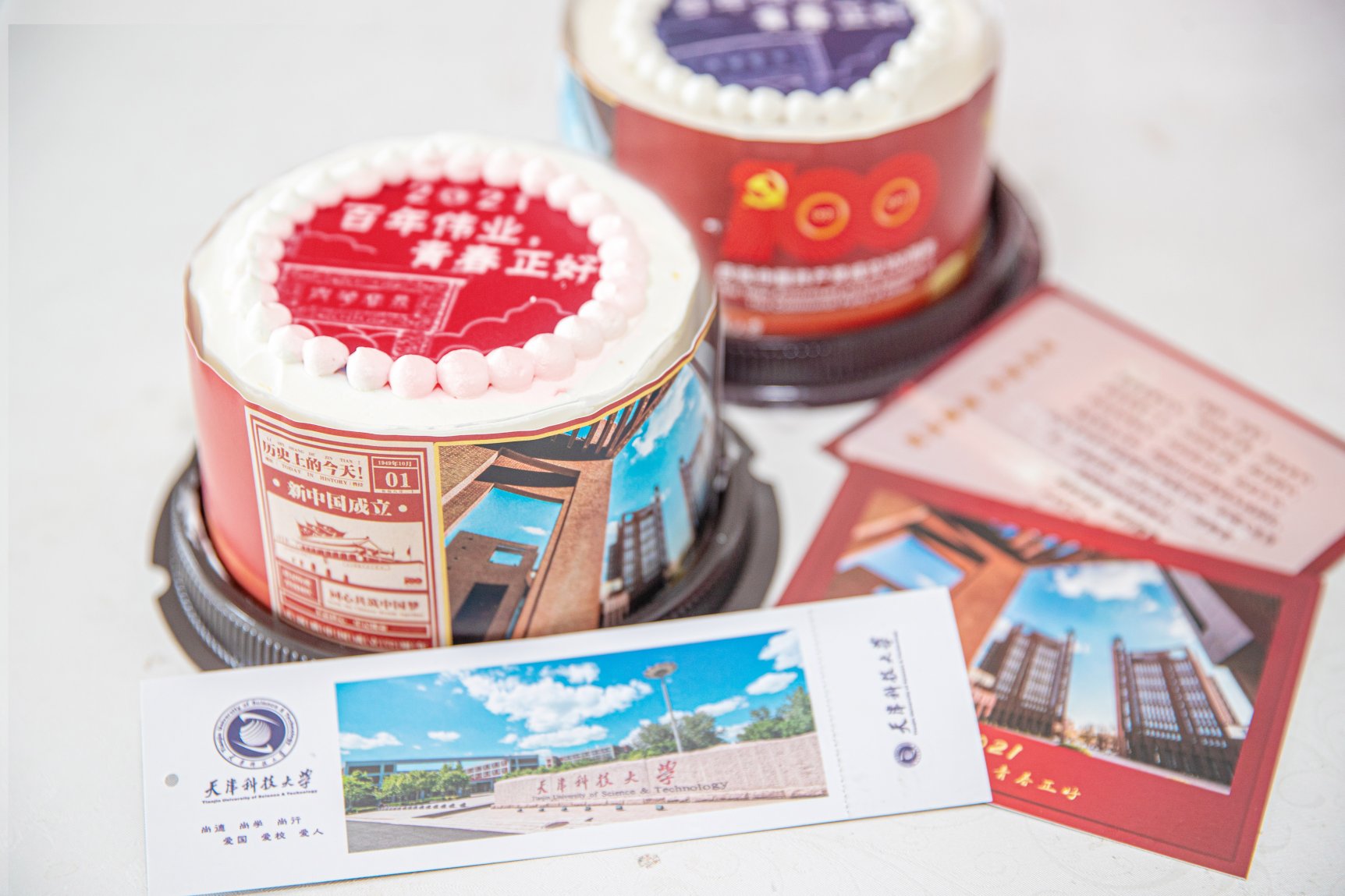 今年离家饭的主题为“百年伟业 青春正好”,就是借建党百年之契机,望学子报国而奋斗,这也是此次活动的另一亮点。发放蛋糕的外包装呈现了天津科大艺术设计学院视传与环艺本科生党支部党员创作的100幅“画说党史”海报作品,选取了包括红船起航、星火燎原、红军长征、遵义会议、百团大战、开国大典、三大改造、改革开放、香港回归、北京奥运、一带一路、迈向新征程等100个经典事件,全景式展示了从1921年至今100年来党波澜壮阔的历史成就,以此引导广大毕业学子树立正确历史观,不忘初心,昂首阔步,奋发向前。