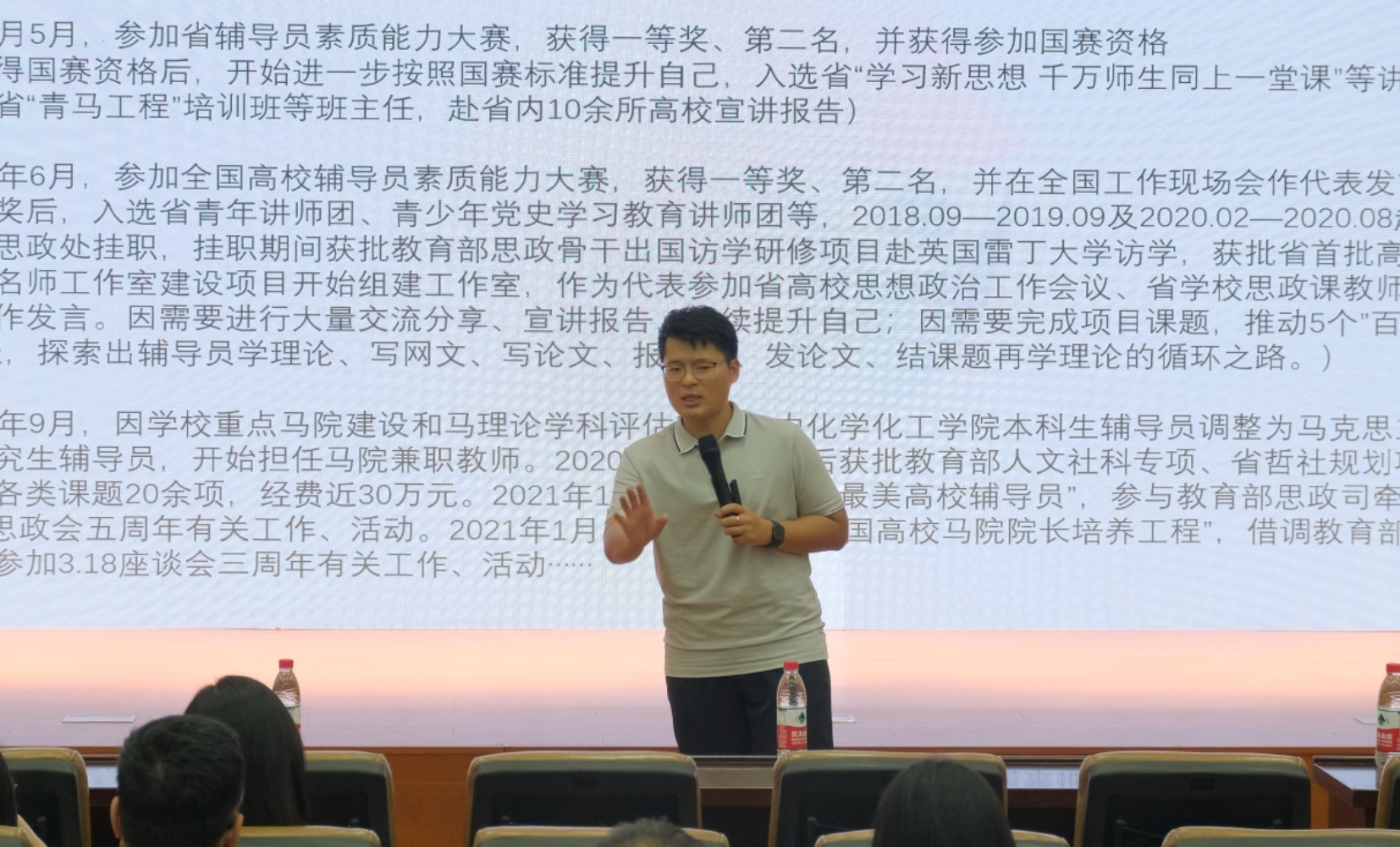 尹明做了《在理论学习提升中感悟思政育人力量》主题讲座。他系统总结了“一条主线、两种维度、三个遵循”的备赛思路,详细梳理与加强和改进大学生思想政治教育工作、推动辅导员工作专业化职业化有关的重要会议、政策文件,并且对理论知识各种不同的题型一一进行讲解,指导大家功夫用在平时,夯实理论功底、总结凝练提升。