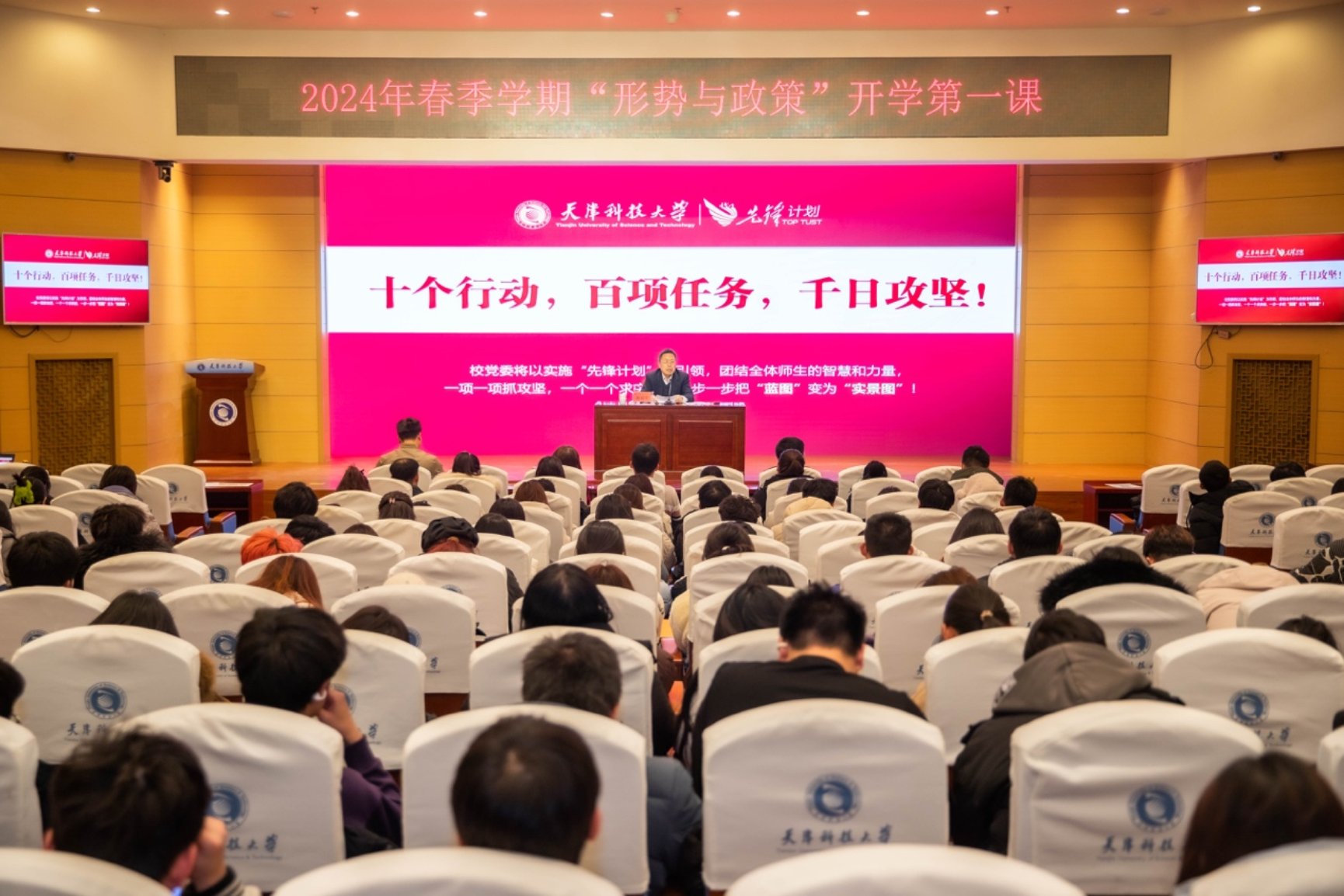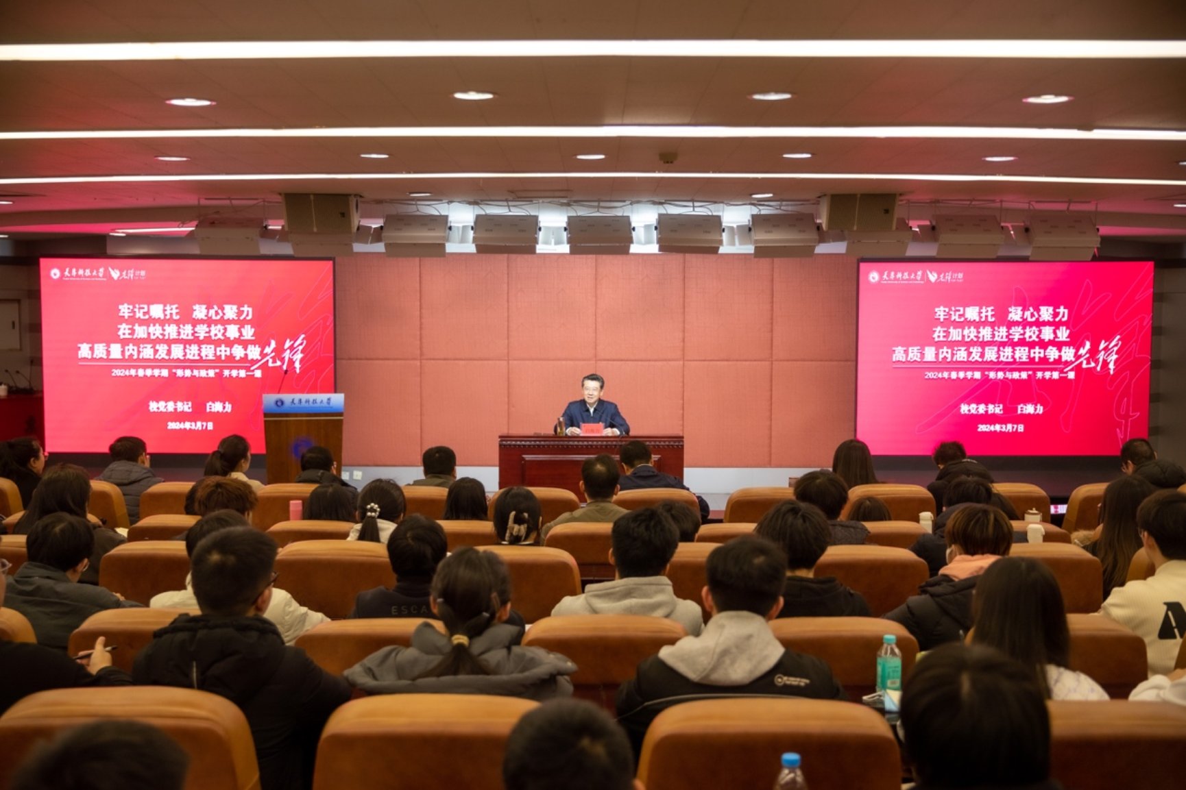校党委书记白海力,校党委副书记、校长路福平在两校区以“牢记嘱托凝心聚力在加快推进学校事业高质量内涵发展进程中争做先锋”为题为科大学子讲授开学第一课。白海力、路福平带领同学们一起重温了习近平总书记视察天津的温暖片段,感受了领袖的为民情怀;一起认真学习了习近平总书记视察天津重要讲话精神,感悟了习近平新时代中国特色社会主义思想的真理力量和实践伟力。以“数说”的形式,深入浅出地详细解读了我校全面贯彻落实习近平总书记视察天津重要讲话精神,全力实施“先锋计划”的实际行动和具体举措。