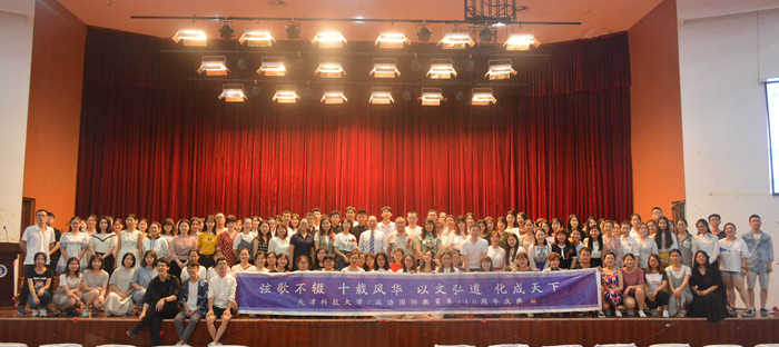 “十年沉淀,人文在兹”。2018年6月23日下午,我校法政学院汉语国际教育系成立十周年庆典在滨海校区千人礼堂举行。校党委副书记张爱华出席会议,法政学院党政负责同志、葛沽民俗促进会有关负责同志参加庆典。庆典开始前,各位领导、嘉宾和系友一同参观了该系在千人礼堂大厅举办的中华才艺教育成果展,对该系在校生创作的书画、剪纸、诗词等才艺作品表示赞赏。