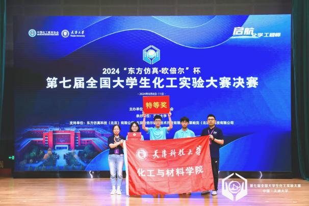 8月8-11日,由中国化工教育协会主办、天津大学承办的2024“东方仿真•欧贝尔”杯第七届全国大学生化工实验大赛总决赛在天津大学北洋园校区举行。天津科技大学化工与材料学院以华北赛区总成绩第一的资格进入全国总决赛。经过三天激烈角逐,最终决出团队特等奖10个、一等奖32个、二等奖42个。我校2021级雷浩天、禚文瀚和高辉三名同学组成参赛队,在王栋、晏丽红、赵文立三位教师的指导下,在总决赛中再次取得好成绩,荣获团体“特等奖”,这也是该项赛事举办以来,我校学子在国赛中第三次问鼎全国特等奖。