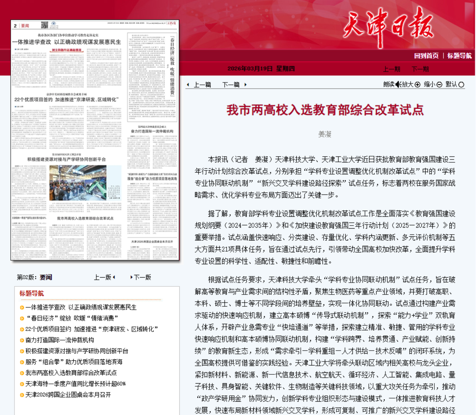 3月19日,《天津日报》发布题为“我市两高校入选教育部综合改革试点”的报道。