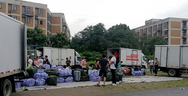 搬迁工作前期,为提高工作效率,提前做好109辆货车、50辆客车的搬迁车辆调度预案,有序完成了学生搬迁前宿舍水电登记及费用核算、入住前宿舍保洁及家具、水电、网络的调试、搬迁物资的发放、设定行李放置点等工作。同时,因校内地下管网施工及阴雨天气等不利因素,为搬迁工作的开展增添不少困难,在学生处、保卫处以及各搬迁学院的共同配合下,合理的车辆交通路线、平稳的校内交通秩序、有序高效的行李搬运、清晰的工作引导,特别是广大教职工的积极参与以及电子信息学院30余名国防生志愿者的加入,圆满完成了 7月14日、15日我校机械、包印、电信、国际、法政、外语、经管等7个学院的2779名全日制本科学生由滨海校区至河西校区的搬迁工作。