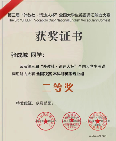 在5月27日结束的第三届“外教社•词达人杯”全国大学生英语词汇能力大赛全国决赛中,我校2021级人力资源专业张成城同学荣获国赛二等奖!