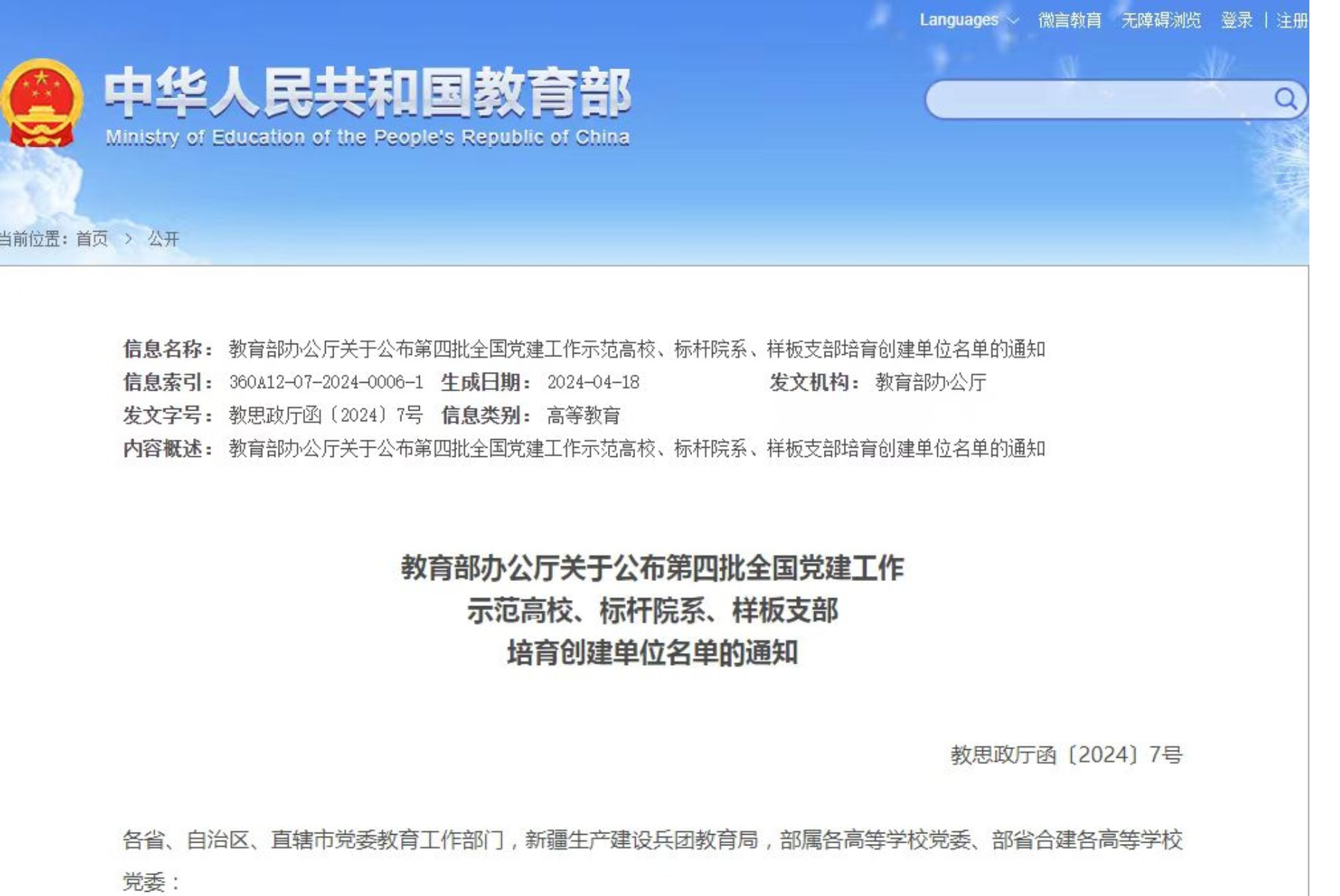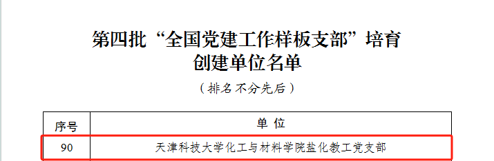 近日,教育部公布了第四批全国党建工作示范高校、标杆院系、样板支部培育创建单位名单。经校院两级党委和教育工委推荐、资格审查、专家推荐、教育部党的建设和全面从严治党工作领导小组成员单位集中审议、结果公示,我校化工与材料学院盐化教工党支部成功入选第四批“全国党建工作样板支部”培育创建单位。这是我校基层党支部在入选前三批全国党建工作样板支部培育创建单位之后又一次斩获殊荣!