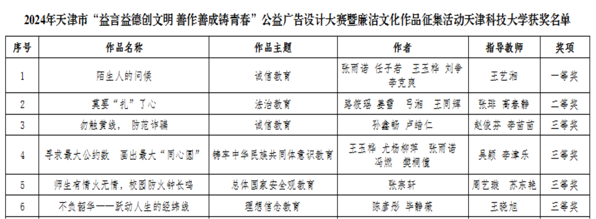 近日,由市教委、市文明办、市文化和旅游局、市妇儿工委办、市妇联组织举办的2024年天津市“益言益德创文明 善作善成铸青春”公益广告设计大赛暨廉洁文化作品征集活动获奖名单揭晓。我校共有15项作品获奖,其中一等奖1项,二等奖1项,三等奖4项,学校获评优秀组织单位。