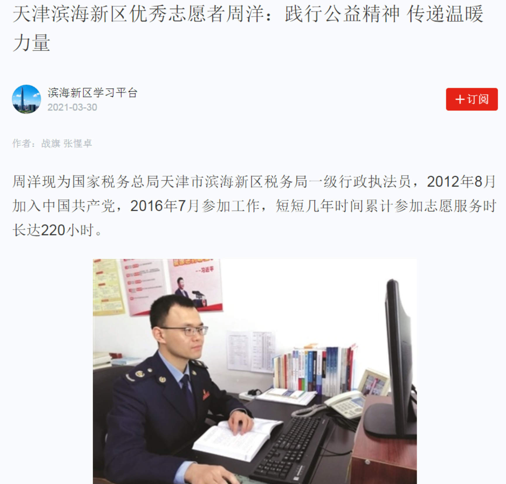 周洋现为国家税务总局天津市滨海新区税务局一级行政执法员,2012年8月加入中国共产党,2016年7月参加工作,短短几年时间累计参加志愿服务时长达220小时。