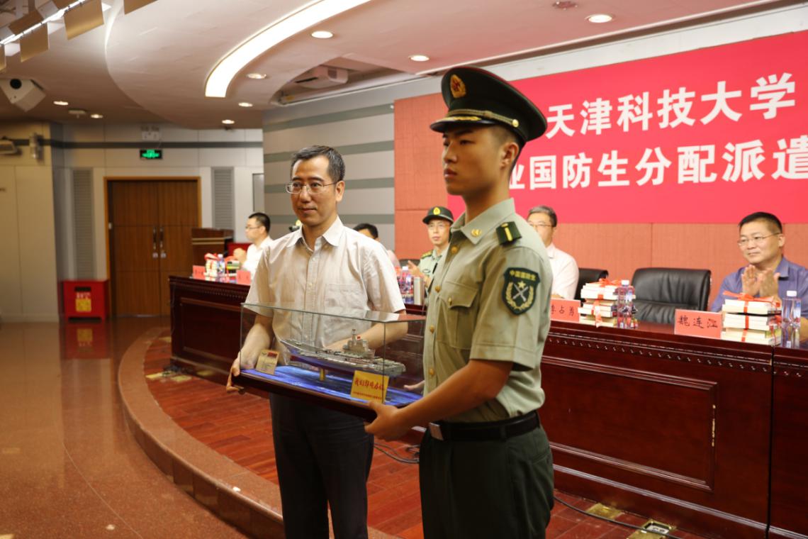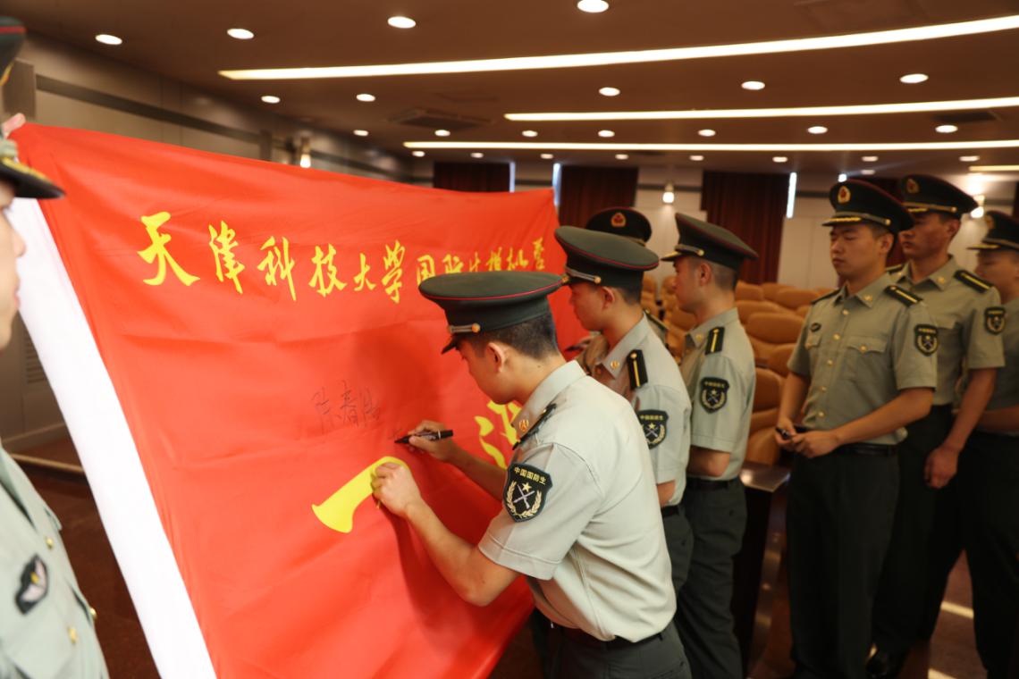 马海峰宣读了毕业国防生派遣命令。国防生用一声声铿锵有力的回答表达了投身军营的信念和决心。会上,毕业国防生与学校互赠纪念品,表达了不忘母校培养、不忘恩师教诲的深情,表达了师长对国防生履职尽责的期待和祝愿。在连旗告别仪式上,国防生在模拟连连旗上签名,表示一定为国防生旗帜争光,立足岗位,建功基层。