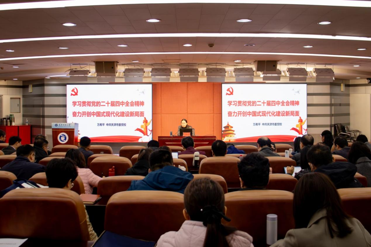 近日,我校在河西校区主楼C区报告厅举办学习贯彻党的二十届四中全会精神专题报告会暨党委理论学习中心组(扩大)会议。天津市委党校哲学教研部万希平教授应邀作报告。校领导、全体中层干部180余人参加。