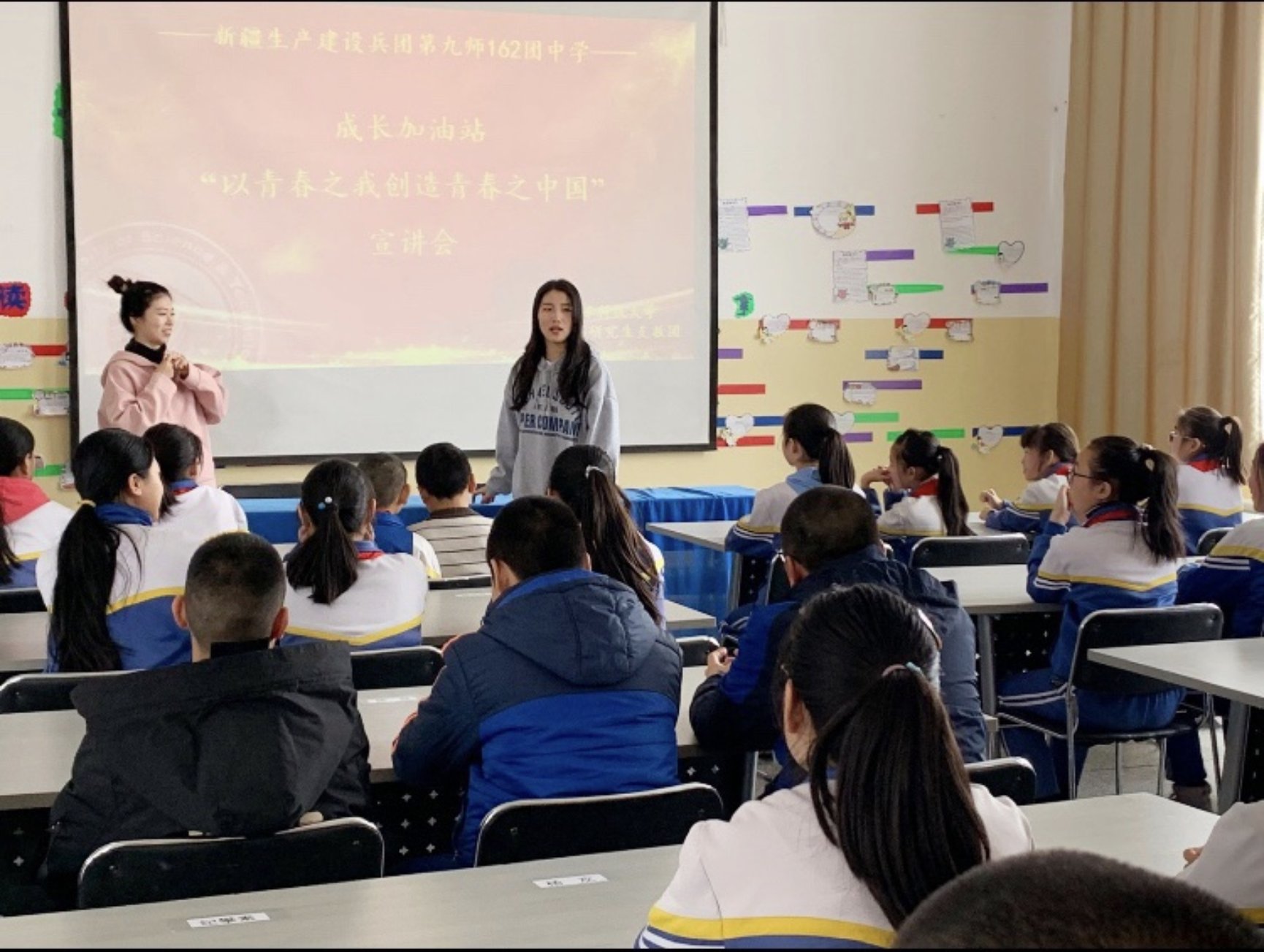 支教期间,她以“奉献、友爱、互助、进步”为宗旨,以服务新疆、服务兵团、服务一六二团为目标,时刻牢记秉承教育是阻断贫困代际传递的根本之策这一理念,以教书育人为本职,以志愿服务为形式,以奉献精神为初心开展助学扶贫,为深入了解团内学生及家庭的情况,她对贫困家庭逐一进行家访,有针对性地进行帮扶,并先后组织了“伟大的中国梦和她的梦”巡讲、“七彩假期”爱国主义教育和学习身边“屯垦戍边战士”等活动,加强对学生的思想引领、品德教育和民族自豪感,在学生的内心埋下热爱祖国、志存高远、无私奉献的种子,帮助学生扣好人生的第一粒“扣子”。