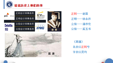 企业面临的债权与债务,正常的解决方式是遵循诚信规则,欠债还钱。实务中存在企业诚信意识不强,也存在会计从业人员滥用会计准则粉饰报表现象。课堂上通过“说说历史上他们的事”环节弘扬中华民族传统文件中“诚信”,穿插古代管仲与孟子的诚信思想,民国期间中国四大会计师事务所对诚信的信仰,如下图所示。