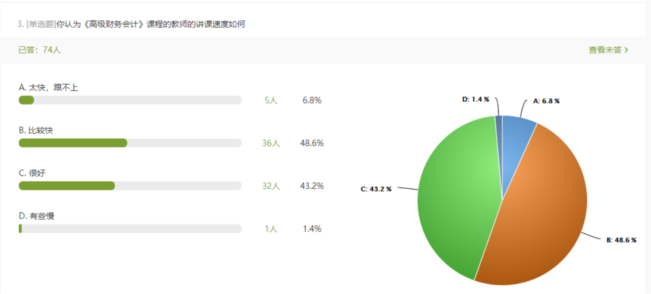 课程的教学设计是在学生的学情调研的基础上,不断修订。2019-2020-2学期18级《高级财务会计》两个教学班针对课程教学方式、教学内容、课程互动方式等8方面内容进行问卷调研,如学生对课堂互动方式反馈情况如图6所示,对教师的讲课速度调研中,48.6%的同学认为速度较快,教师在后续课程中相应放慢节奏,如下图所示。