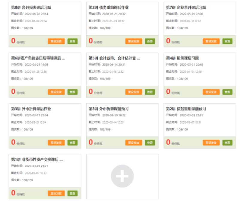 在教学过程中为了解学生的学习情况,及时发现教学中的问题采用章节作业和期中测验来进行形成性评价。作业和测验必须考虑教学章节中的能力目标。通过形成性评价,随时了解学生在学习上的进展情况,获得教学过程中的连续反馈,为随时调整教学计划、改进教学方法提供参考。本课程还包括培养学生通过文献案例研究解决问题的能力,教师在授课过程中,可根据章节内容情况安排案例讨论课及搜索分析类作业。考核方式由课堂活动表现、期中线上小测、平时线上作业及期末闭卷考试构成,要求具体如下:课堂活动表现10%,期中线上小测10%,平时线上作业30%,期末闭卷考试50%。2019-2020-2学期18级《高级财务会计》两个教学班(74人,108人)共通过学习通平台发布10次作业(8次课后作业,两次课前小测作业),如下图所示。