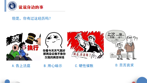 本章债务重讲解的是债权债务在特殊情况下的一种处理方式,在导入课堂环节,引导学生债权债务在按原有的规定不能正常偿还时应如何处理?用身边的事引导学生解决实际问题的能力,同时也渗透中华民族传统文化的智慧结晶“变通”,如下图所示。