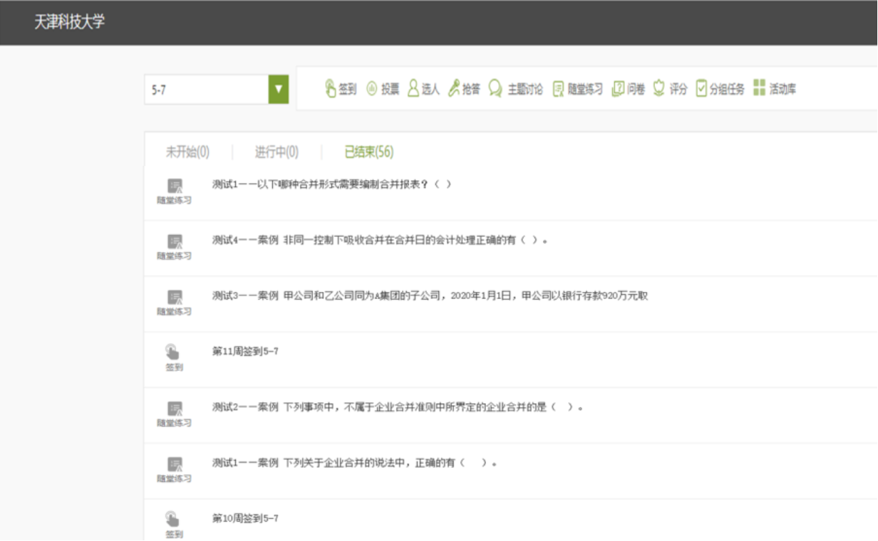 2019-2020-2学期18级《高级财务会计》两个教学班共通过学习通平台发布课堂活动56次,主要包括签到、课堂抢答、课堂知识小测、课堂学习情况问卷反馈等活动,如下图所示。
