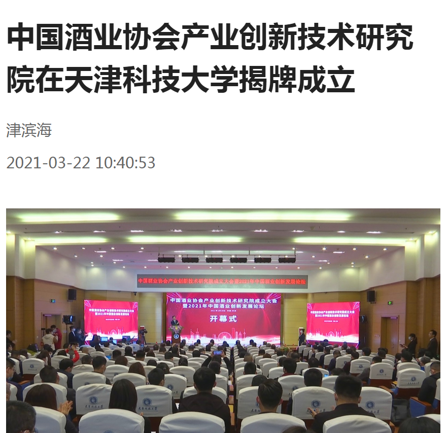 3月22日,津滨海、《滨城新闻》报道中国酒业协会产业创新技术研究院成立大会暨2021年中国酒业创新发展论坛在我校召开。