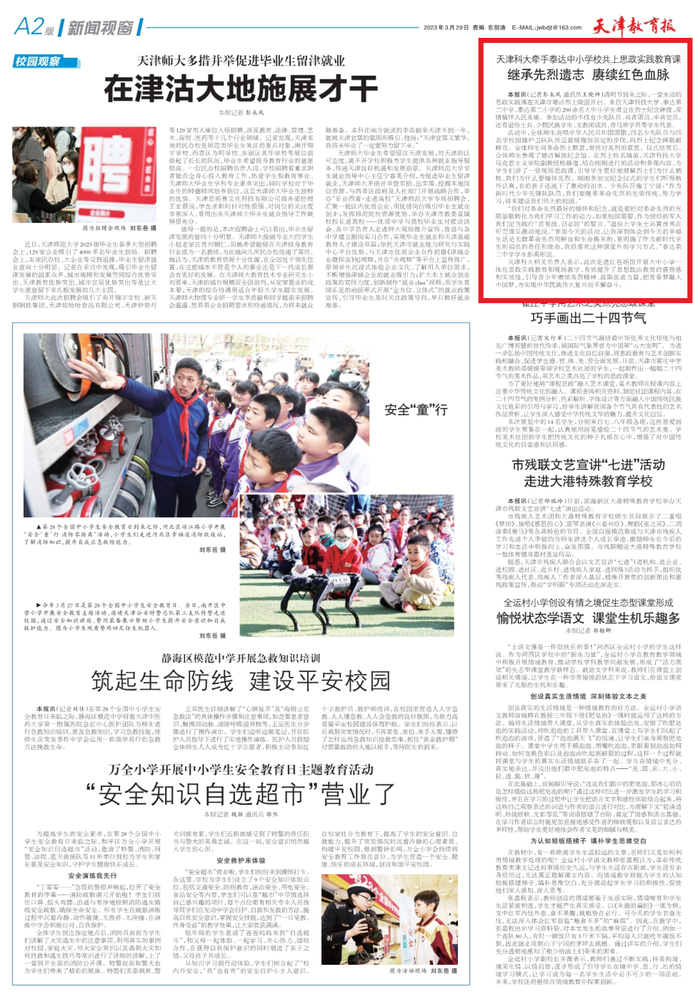 3月29日,《天津教育报》报道天津科技大学牵手泰达中小学校共上思政实践教育课,共同继承先烈遗志,赓续红色血脉。清明节到来之际,一堂生动的思政实践课在天津市塘沽烈士陵园开启。来自天津科技大学、泰达第二中学、泰达第二小学的 200 余名大中小学生肃立在烈士纪念碑前,深情缅怀人民英雄。参加活动的不仅有少先队员、共青团员、中共党员, 还有退役士兵、少数民族学生、支教团成员、青马班学员等学生代表。天津科大相关负责人表示,此次走进红色场馆开展大中小学一体化思政实践教育和现场教学,有效提升了思想政治教育的获得感和实效性,引导青少年赓续英烈精神、汲取前进力量,把青春梦融入中国梦,为实现中华民族伟大复兴而不懈奋斗。