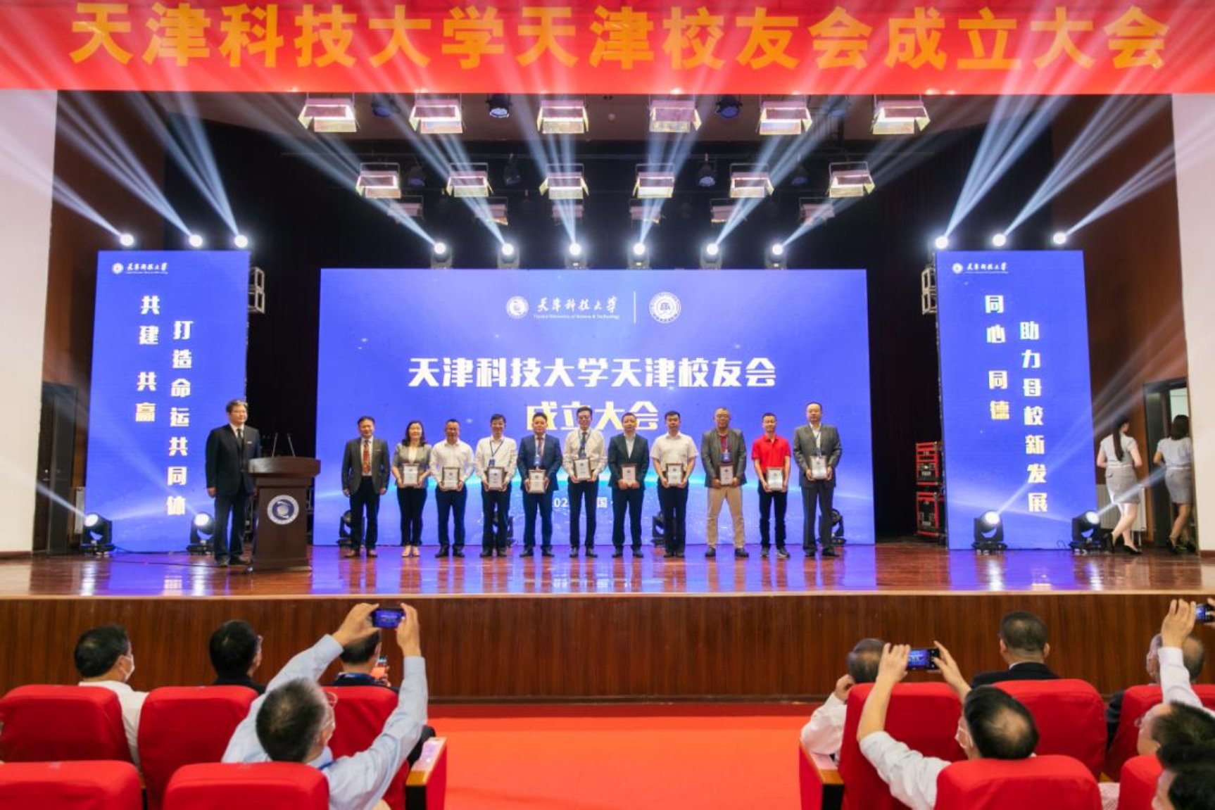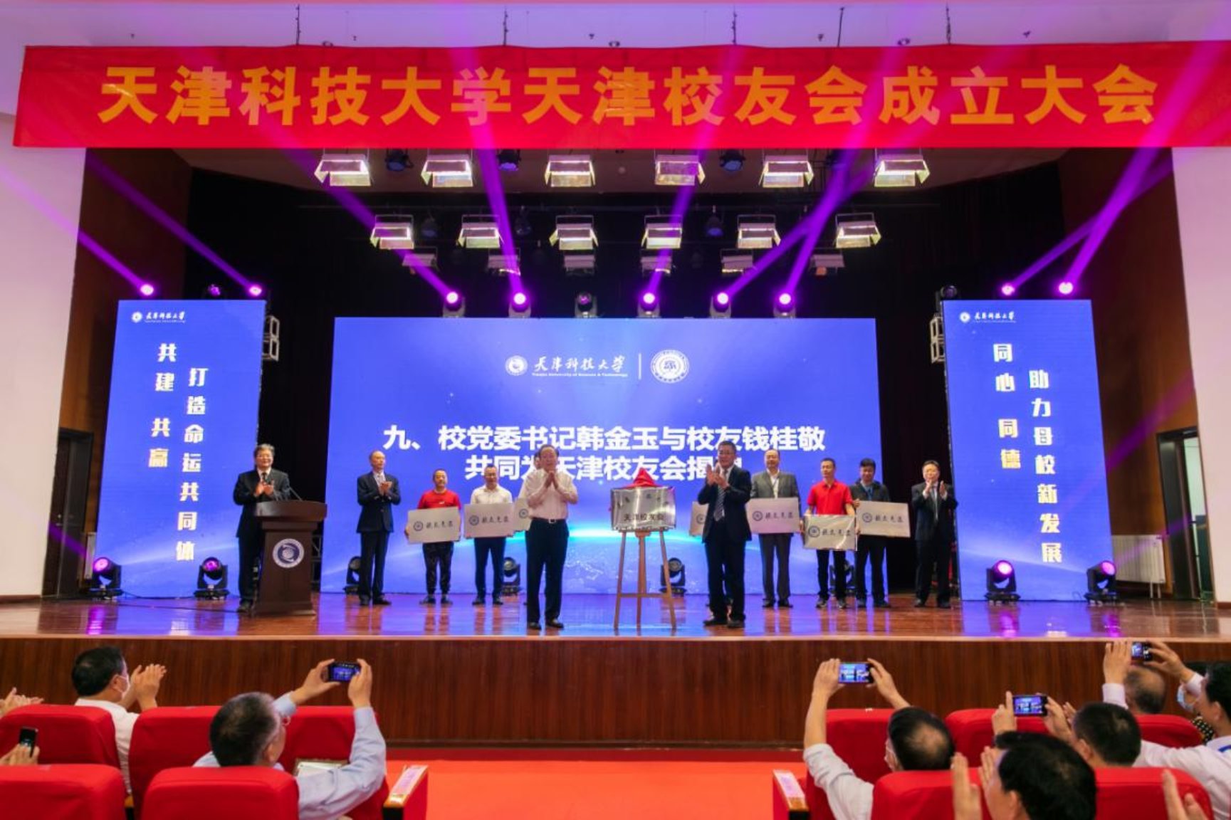 会上,校领导分别为天津校友会理事、监事以及校友会相关负责人颁发聘书。此外,在津首批建立的七个校友之家也在会议现场进行了授牌仪式。大会最后,韩金玉与钱桂敬校友共同上台,为天津校友会揭牌。