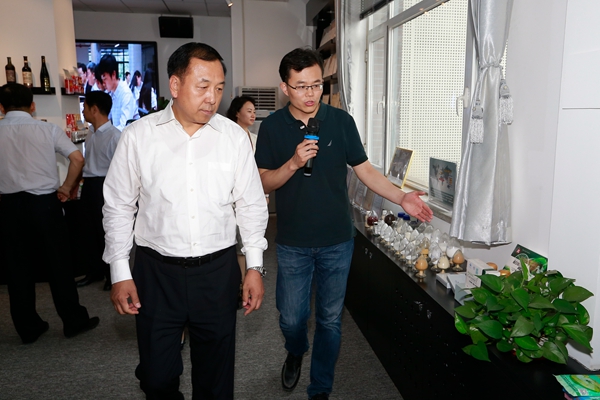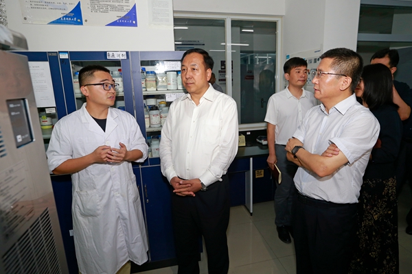 在滨海校区中区逸夫楼,杨茂荣一行参观了省部共建食品营养与安全国家重点实验室和展室,并与实验室相关负责同志亲切交流,详细了解了实验室研究方向、科技创新、成果转化等情况,对我校在食品安全快速检测、微型保鲜冷库等方面的研究成果予以肯定。