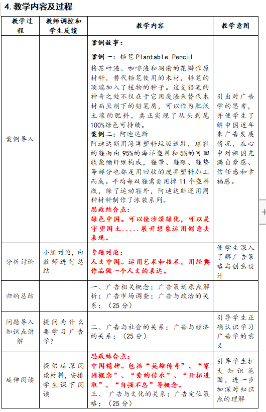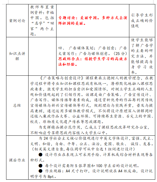 《广告策略与创意设计》课程在新时代设计艺术学科的发展背景下,围绕轻工特色学科,组建食品、包装、视觉传达设计、印刷专业链,通过学分制方式满足学生的个性化需求和能力拓展,结合学校坚持培养“高素质应用型”人才办学定位,确立了“人文素养+创意综合实践”的培养目标,教学团队现有教师5人,其中教授1人,副教授3人,讲师1人。课程采取“课程思政+一流课程建设+美育”的教育模式,推进“新文科”建设。该课程在智慧树平台上已上线运行多个学期,已有29个学校的2万余名学生完成线上学习,课程配套教材《广告策划与媒体创意(修订版)》获中国轻工业优秀教材二等奖。