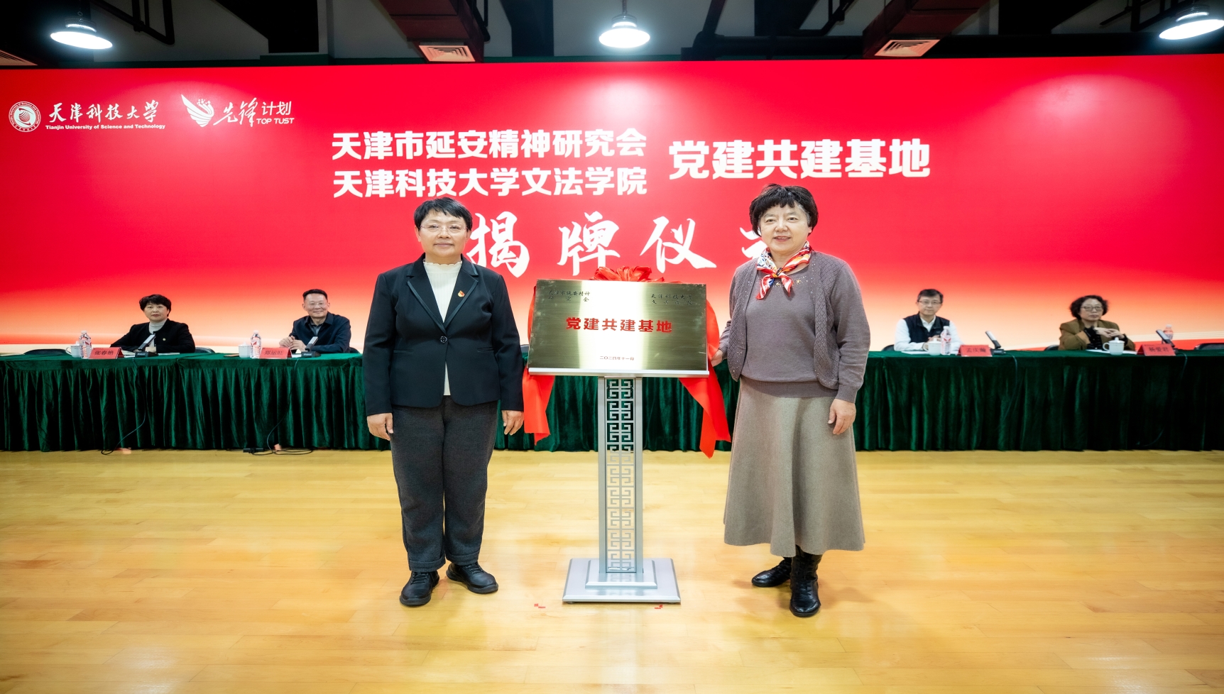 会上,天津市延安精神研究会副会长谷梅与我校文法学院党委书记张艳秋为“党建共建基地”揭牌。