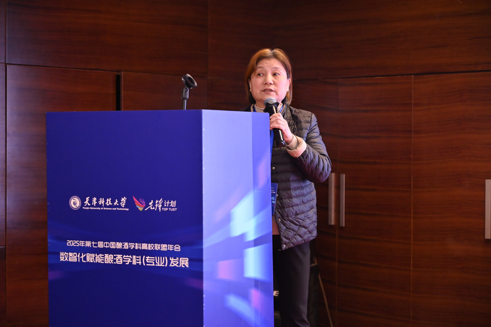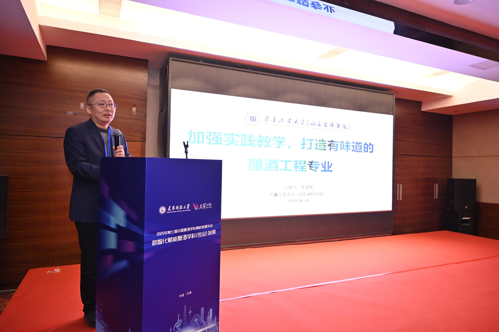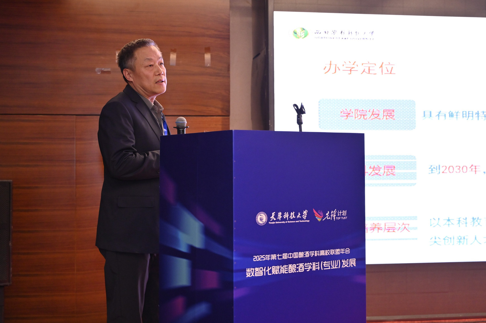 天津科技大学党委副书记、校长路福平在开幕致辞中,代表学校向与会嘉宾表示热烈欢迎。他指出,本届年会聚焦“数智化赋能酿酒学科发展”,精准回应了产业变革的时代需求。路福平介绍了天津科技大学在酿酒学科方面的深厚积累,包括发酵工程国家重点学科、生物工程国家级一流本科专业,以及本硕博完整人才培养体系。近年来,学校通过建设市域产教联合体、现代产业学院等平台,推动酿酒学科从“传统酿造”迈向“智能酿造”。面对数智化浪潮,学校积极推动学科交叉,开展智能酿造工艺、风味物质调控等前沿研究,并与多家天津本土企业深化合作,共建研发中心与人才基地,促进科技成果转化。路福平提出三点合作倡议:共筑数智化人才培养新高地,推动课程共建与跨学科知识体系建设;共拓产学研协同新路径,联合开展关键技术攻关;共建开放共享发展新业态,强化联盟平台功能,共同提升中国酿酒学科的国际影响力。