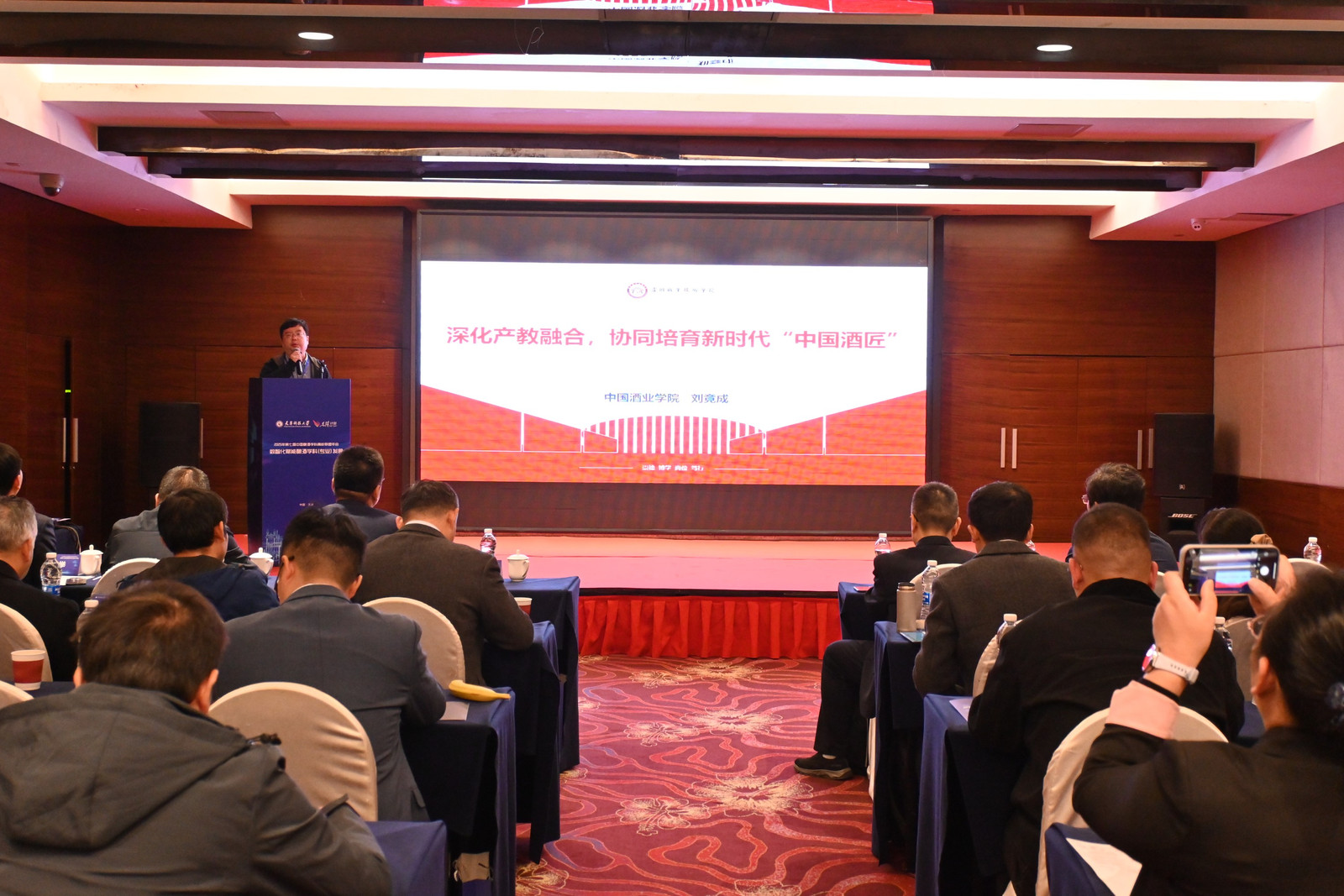 在专家主题报告环节,西北农林科技大学葡萄酒学院张予林教授的“西北农林科技大学葡萄与葡萄酒工程学科(专业)建设探索与实践”、南昌大学付桂明教授的“南昌大学生物工程学科建设成效”、齐鲁工业大学李丕武教授的“加强实践教学,打造有味道的酿酒工程专业”、湖北工业大学方尚玲教授的“服务区域经济,助力行业发展——湖北工业大学酿酒学科的科研实践与发展”、茅台学院郭举教授的 “名企办学、校企一体、产教融合:酿酒产业高素质应用人才培养模式探索与实践”、泸州职业技术学院刘竟成教授的“深化产教融合,协同培育新时代‘中国酒匠’”,共同搭建起本次主题报告的核心内容框架。与会专家围绕各自在学科建设、专业教学、人才培养等领域的实践成果展开深入交流,从学科发展规划、实践教学创新、产教融合路径等多维度进行研讨,为我国酿酒及相关工程学科的高质量建设、行业高素质人才的精准培育提供了极具参考价值的实践经验与发展思路。