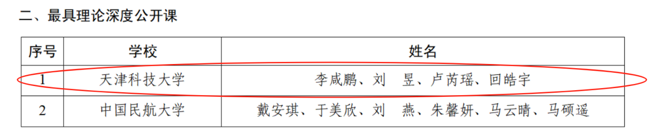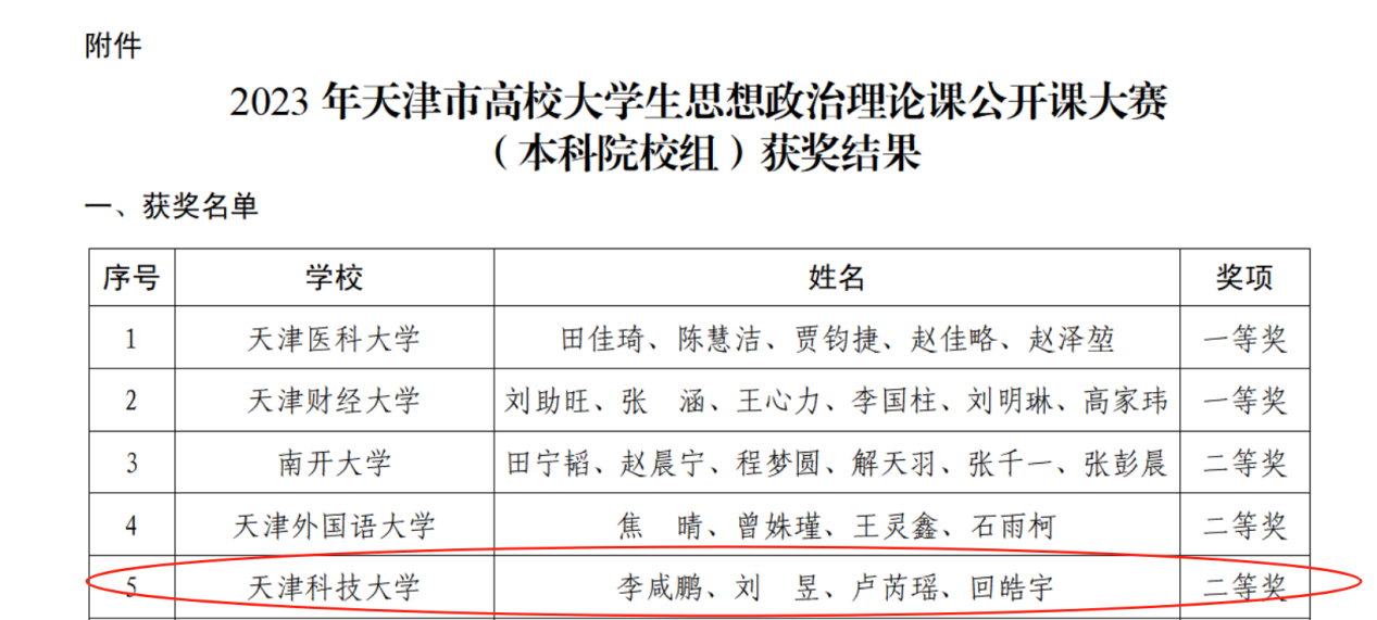 11月24日,由中共天津市委教育工委和天津市教育委员会主办,天津市大中小学思政课一体化教学研究联盟、天津科技大学共同承办的“新思想引领新征程、新青年建功新时代”2023年天津市高校大学生思想政治理论课公开课大赛(本科院校组)决赛在天津科技大学河西校区举办。我校马克思主义学院李咸鹏、刘昱、卢芮瑶、回皓宇等组成的学生团队主讲的公开课“在百年青春对白中探寻党的初心使命”获天津市大学生思想政治理论课公开课大赛二等奖、最具理论深度公开课奖;杨静逸、郭昕获优秀指导教师奖。