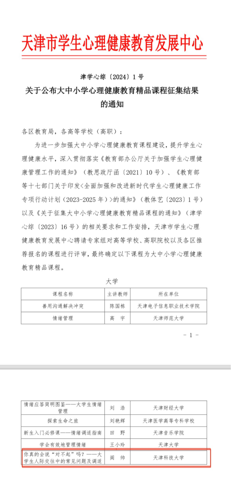 日前,天津市大中小学心理健康教育精品课程评选结果公布,我校心理健康教育与咨询中心心理健康教研室阎帅老师主讲的心理健康教育课程《你真的会说“对不起”吗?——大学生人际交往中的常见问题及调适》获评天津市大中小学心理健康教育精品课程,这是我校在心理育人方面取得的又一荣誉,是对我校《心理健康教育》课程建设的高度肯定,也是辅导员队伍专业化、职业化发展的强大助力。