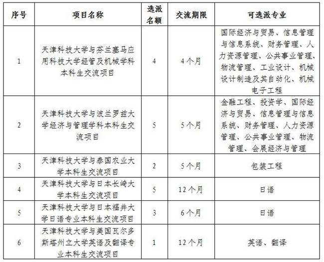 2月27日,国家留学基金管理委员会公布2018年优秀本科生国际交流项目评定结果,我校“天津科技大学与芬兰塞马应用科技大学经管及机械学科本科生交流项目”等6个本科生国际交流项目获得国家留学基金委公派资助,获批资助名额20名,获批项目数和名额数为历年最多。