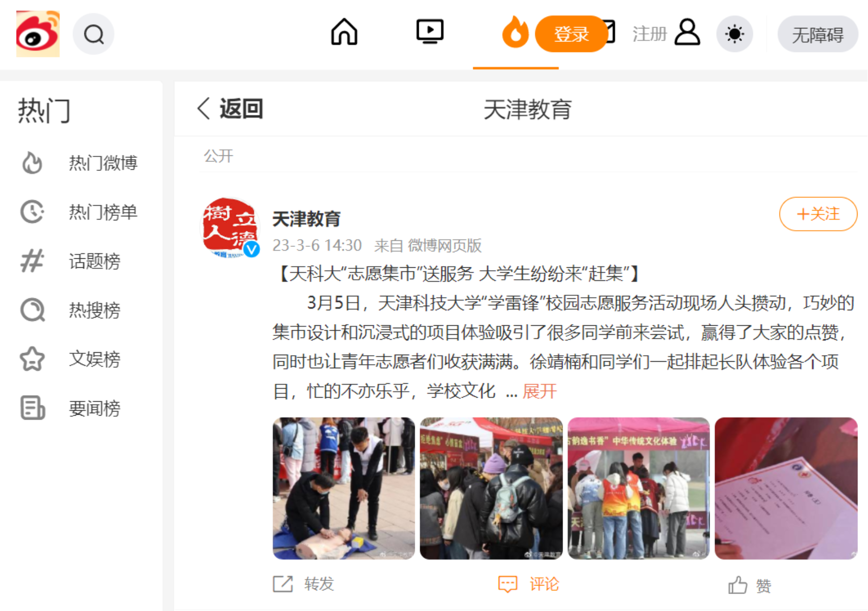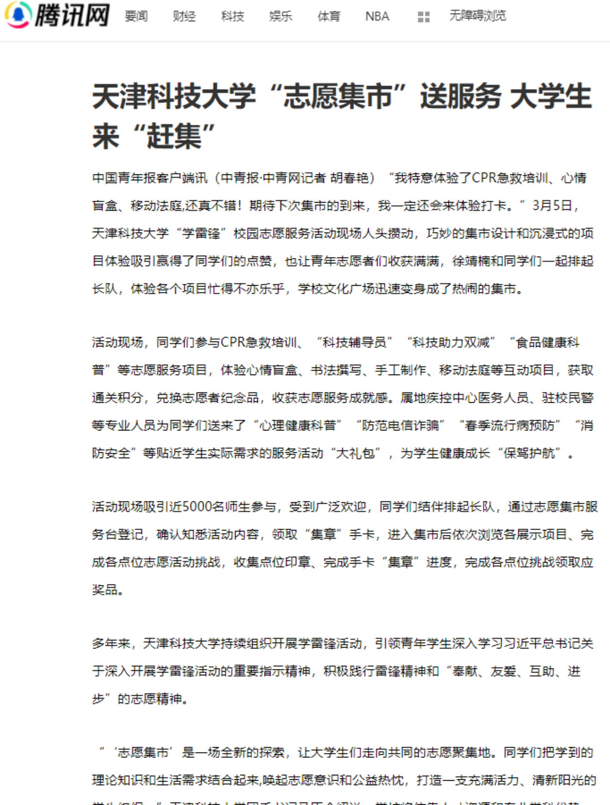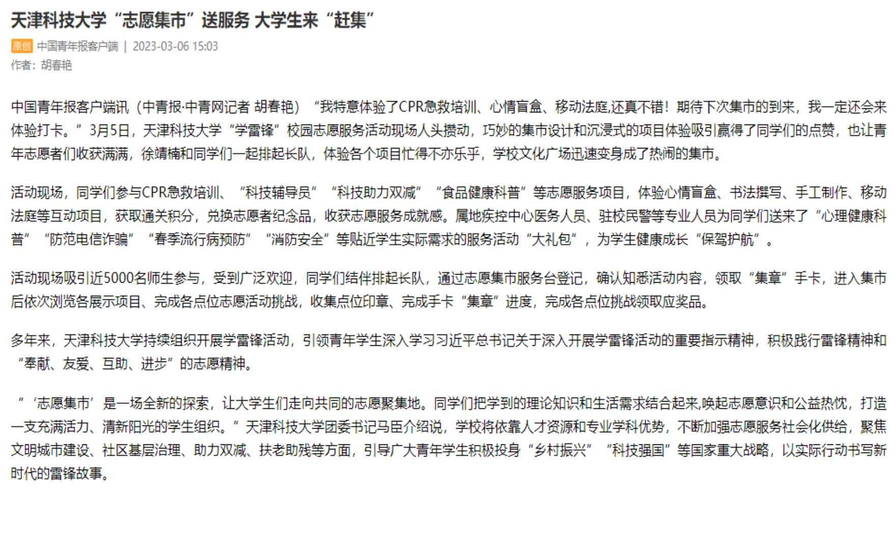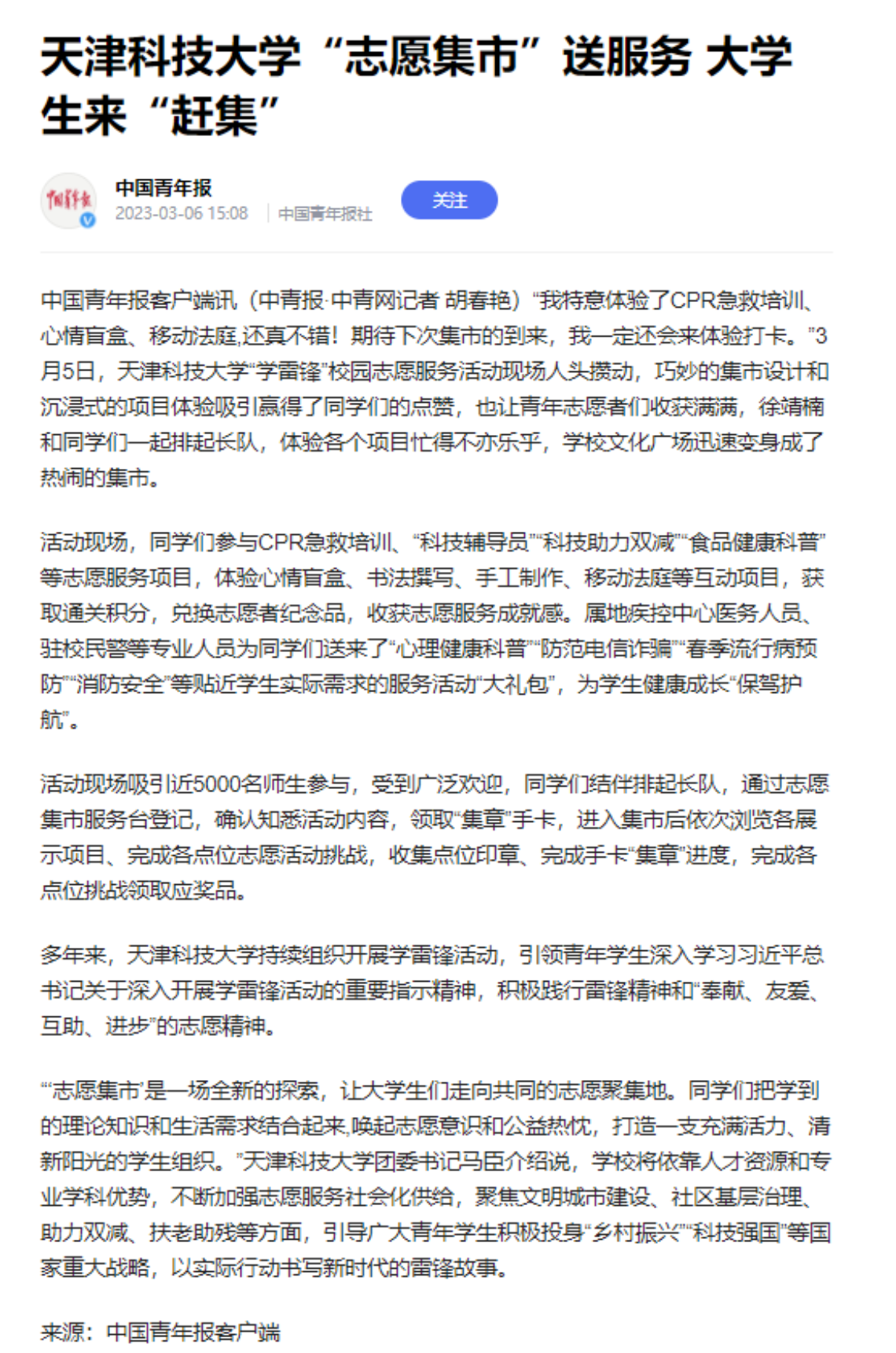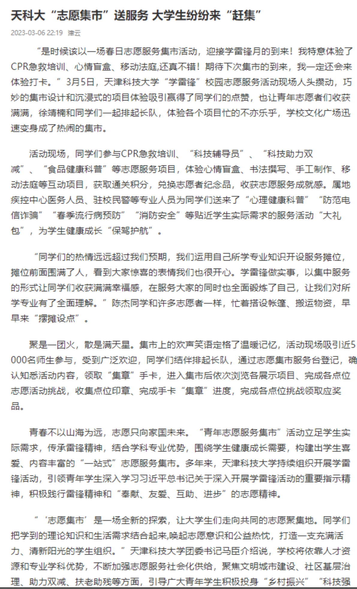 3月6日,《中国青年报》《天津教育报》、津云、微博、百度新闻、腾讯新闻等多家媒体报道我校创新形式开展“学雷锋”活动,大学生争相来赶“志愿集市”。天津科技大学“青年志愿服务集市”活动立足于学生实际需求,传承雷锋精神,结合学科专业优势,围绕学生健康成长需要,构建出学生喜爱、内容丰富的“一站式”志愿服务集市。多年来,天津科技大学持续组织开展“学雷锋”活动,引领青年学生深入学习习近平总书记关于深入开展“学雷锋”活动的重要指示精神,积极践行雷锋精神和“奉献、友爱、互助、进步”的志愿精神。