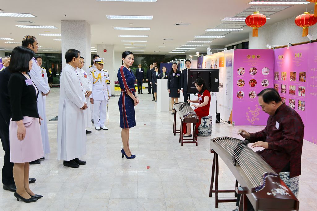 在孔子学院展区,素提达王后观看了我校孔子学院的中国文化活动图片展。中方院长杨海荣向素提达王后介绍了孔子学院的汉语教学情况及与泰国中小学的合作。随后,孔子学院师生用中国的古筝为素提达王后演奏了泰国九世王的名曲《黎明》,素提达王后为孔子学院师生的精彩演奏鼓掌。