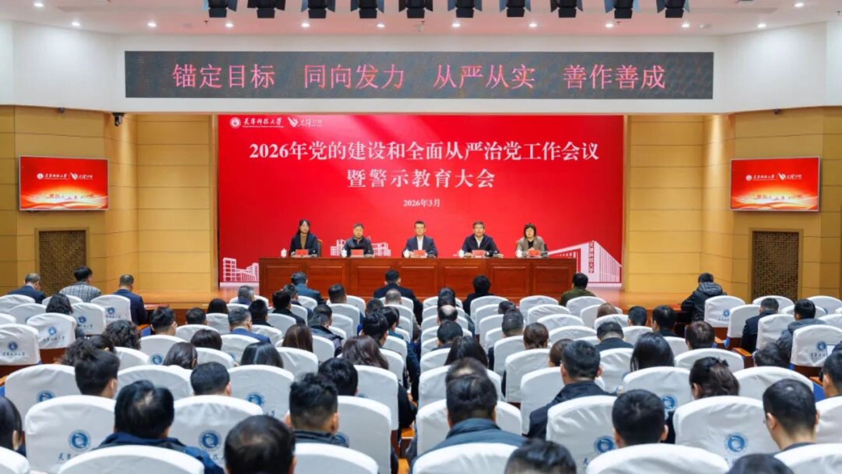 3月24日,我校在滨海校区逸夫楼报告厅召开2026年党的建设和全面从严治党工作会议暨警示教育大会。全体校领导、全体中层干部、驻校纪检监察组有关同志参加。校党委副书记贾启君主持会议。