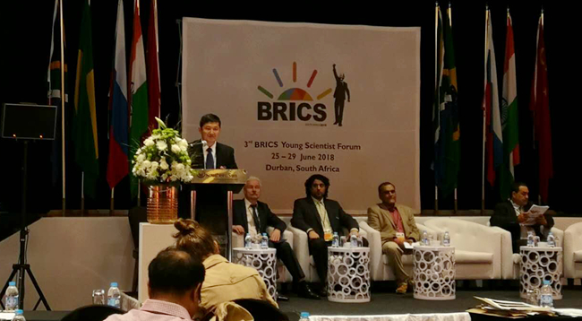 第三届金砖国家青年科学家论坛于2018年6月24日至29日在南非德班举行。本次会议作为第五届金砖国家科技创新部长级会议的配套活动,主题为“共同打造青年科学家的科技创新领导力”,吸引了来自俄罗斯、中国、巴西、印度、南非五个国家超过百名优秀青年学者、专家与政府官员参会。会议由南非科技部海外双边事务处主任内维尔阿伦斯博士(Dr. Neville Arendse)主持,南非科技部副部长德安杜托尼(Daan du Toit)、会场所在地德班市长赞迪(Zandile Ruth Thelma Gumede)出席开幕式并致欢迎辞,南非科技部Bongi Mkhize女士宣读论坛议程。