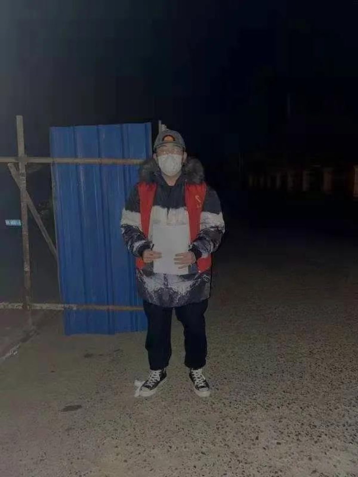 作为回家较早无需隔离的幸运儿,我第一时间报名响应,成为吉林省白山市浑江区江北社区的一名大学生志愿者。志愿服务内容涉及信息登记、体温测量、代购物资、宣传教育、治安巡逻等。在零下三十度的寒风中张贴疫情防控宣传单,对进出小区的所有人员进行详细登记、测量体温是最艰辛的工作,但我总是选择穿着红马甲,窜梭在江北社区的大街小巷。拉条幅、贴海报,这些外展工作中总能看见他的身影。当谈及此次志愿活动,我说道:“为疫情防控做些力所能及的事,是当代大学生应尽职责。”