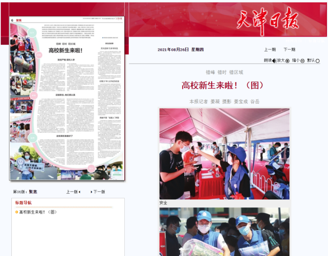 近日,《天津日报》报道我校迎新准备工作。学校为提高报到效率,减少新生集中报到期间人员聚集,采取按学院有规律分散安排报到点的办法,将入校人员化整为零,同时启动手机端的新生报到系统和学校访客登记系统,提前了解学生入学前14天的健康状况和行程安排,力求对入校人员信息精准把握。学生们可在线上完成基本信息填报、绿色通道申请、军训服装登记等报到程序,届时除现场核对本人身份信息和办理住宿手续外,学生几乎不需要再办理其他手续。