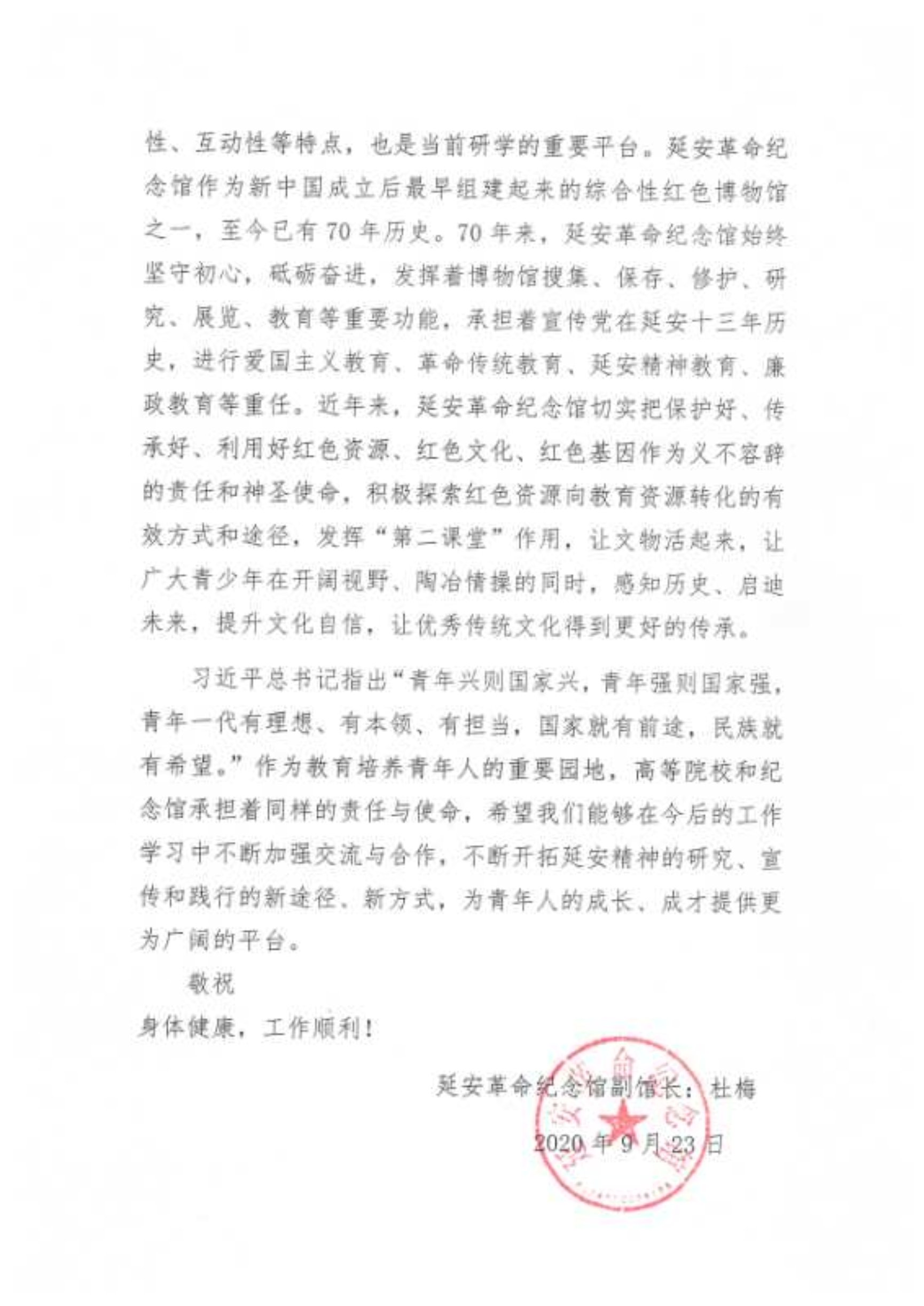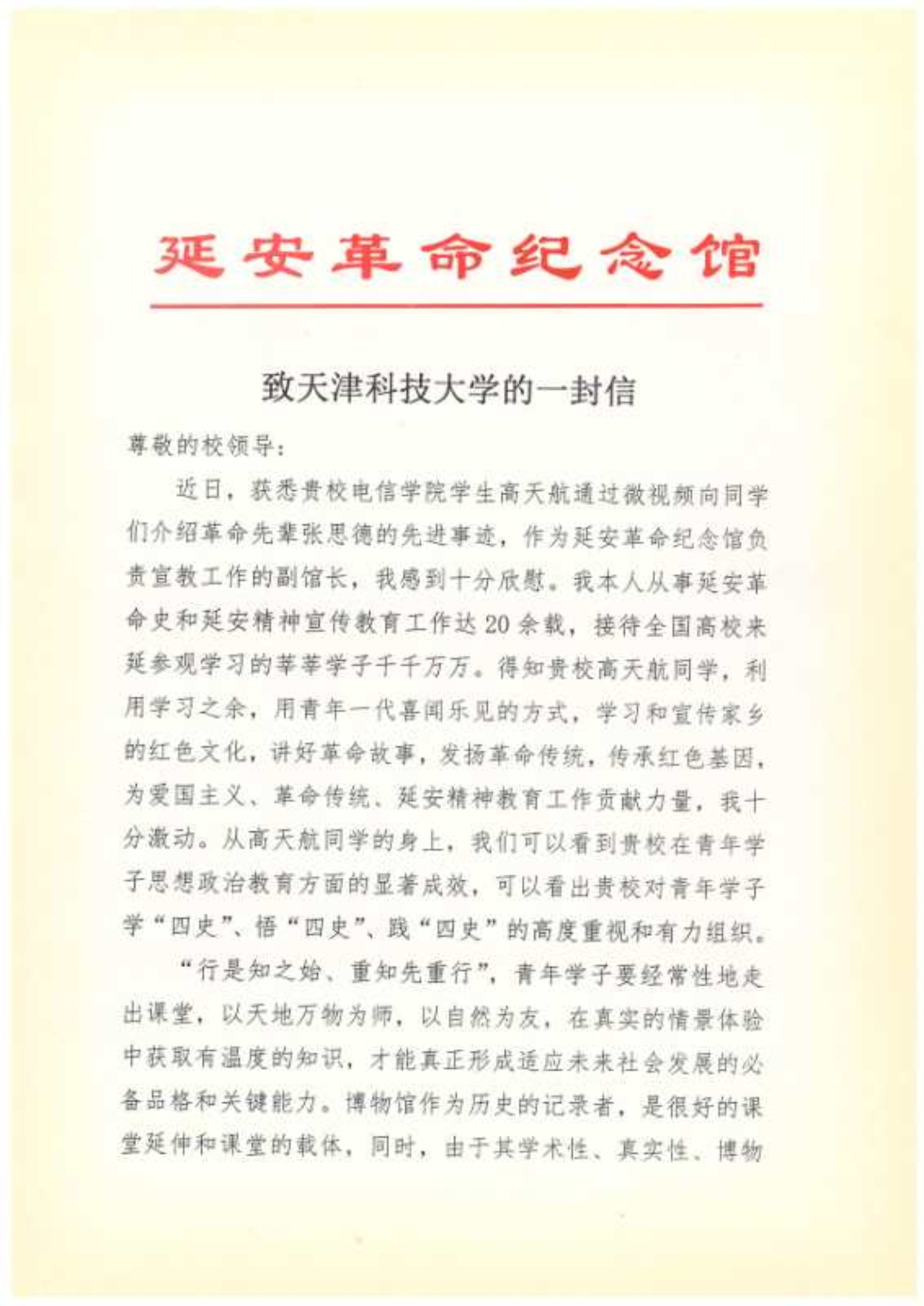 微课一经播出便受到众多媒体的广泛关注,天津日报、天津市教委“津门教育”、天津科技大学、天津科技大学团委、天科大自动化微信公众号等平台相继报道,在高校师生以及社会层面产生了良好反响。同时,“我在家乡讲四史”主题微课近期也被团市委推荐参评“全国三下乡暑期社会实践项目”和“全国百强暑期社会实践团队”的竞评,充分展示了我校在“四史”教育方面取得的实效。如今,来自延安革命纪念馆的这封饱含深情的感谢信,更是对我校学子的高度赞扬,对我校电信学院“我在家乡讲四史”活动的充分认可,对我校坚持立德树人、提升人才培养质量取得成效的有力彰显。