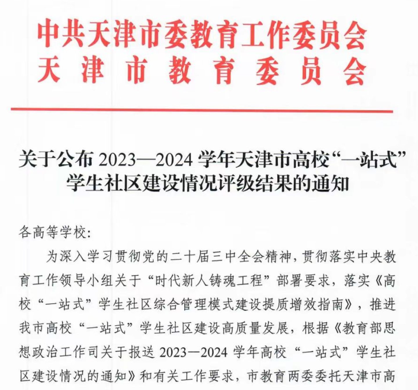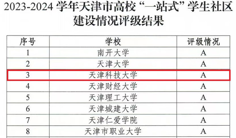 近日,天津市教育两委公布了2023-2024学年天津市高校“一站式”学生社区建设情况评审结果,我校获评“一站式”学生社区建设A级,成为全市8所获此殊荣的高校之一。