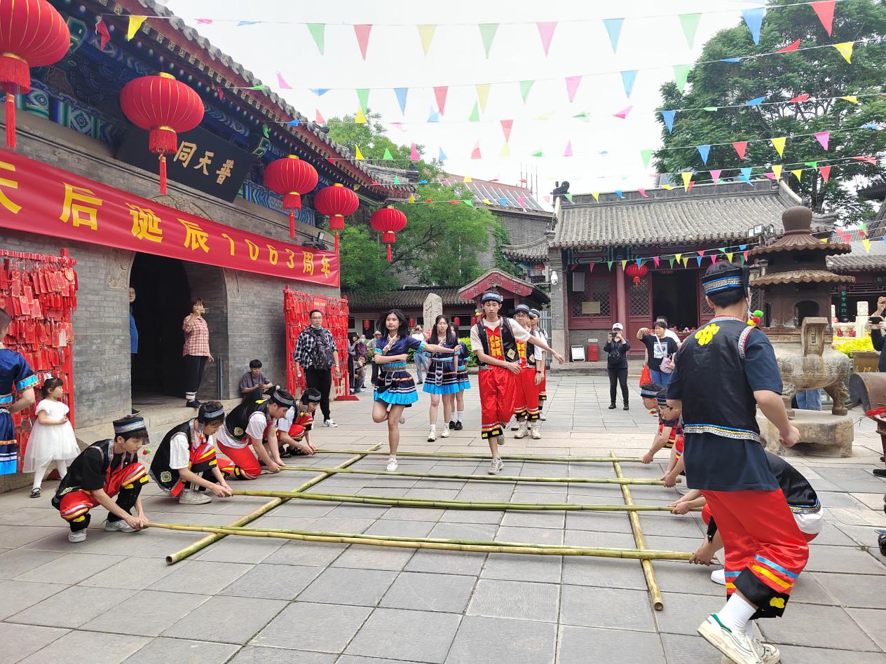 在古文化街天后宫中,师生们认真聆听着讲解员讲述着妈祖文化内涵和特色,以及传至津门的历程,深入了解了天津天后宫与海南海口天后宫间的同根同源,学生们在宫院内跳起了独具海南黎族特色的“竹竿舞”,让妈祖文化南北结合。