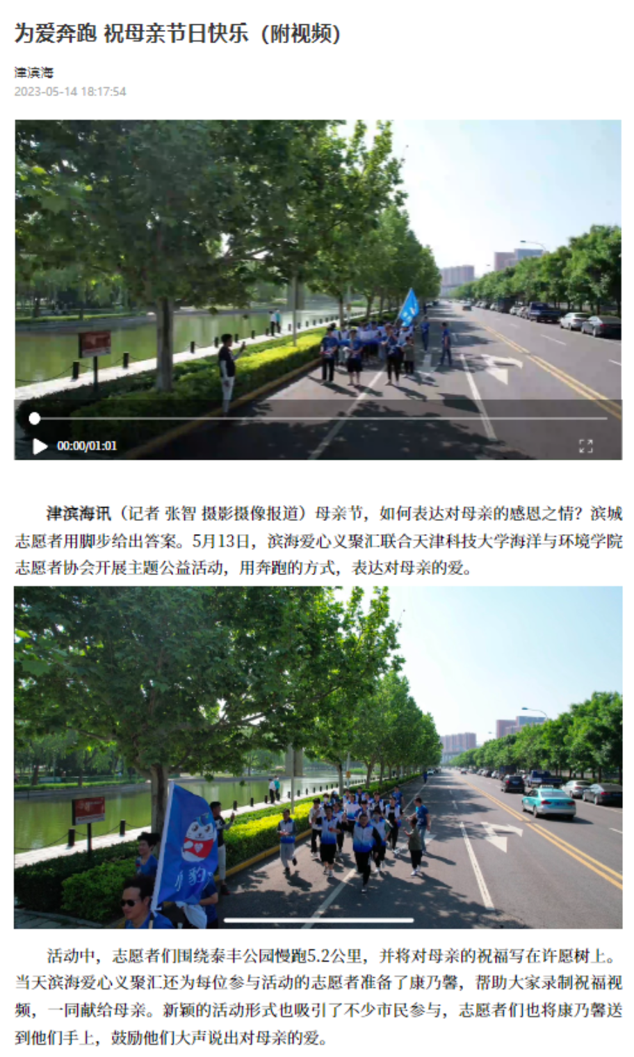 津滨海讯(记者 张智 摄影摄像报道)母亲节,如何表达对母亲的感恩之情?滨城志愿者用脚步给出答案。5月13日,滨海爱心义聚汇联合天津科技大学海洋与环境学院志愿者协会开展主题公益活动,用奔跑的方式,表达对母亲的爱。