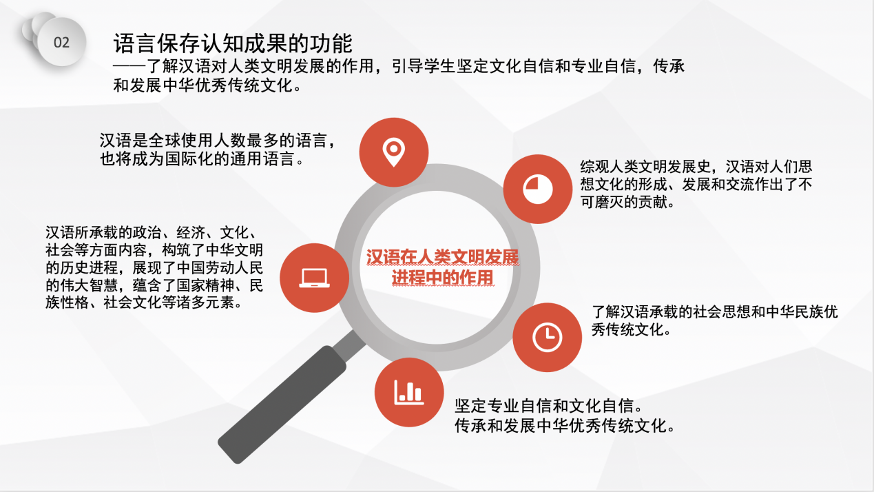 2.语言保存认知成果的功能。引导学生了解汉语承载的社会思想和中华民族优秀传统文化,帮助学生坚定专业自信和文化自信,传承和发展中华优秀传统文化。