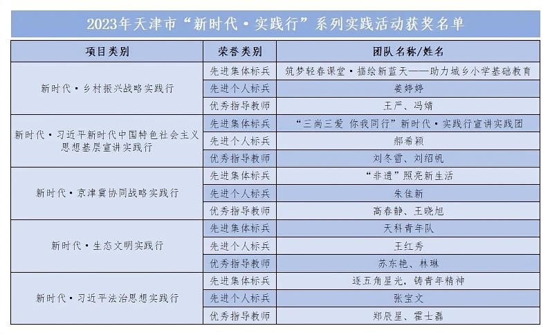 近日,我校在天津市2023年“新时代·实践行”系列实践活动评比中喜获佳绩。我校师生荣获“新时代·乡村振兴战略实践行”“新时代·习近平新时代中国特色社会主义思想基层宣讲实践行”“新时代·京津冀协同战略实践行”“新时代·生态文明实践行”和“新时代·习近平法治思想实践行”全部5个实践主题方向先进集体标兵和先进个人标兵,再获标兵荣誉“大满贯”。同时,我校在本次活动评比中荣获优秀组织单位奖。