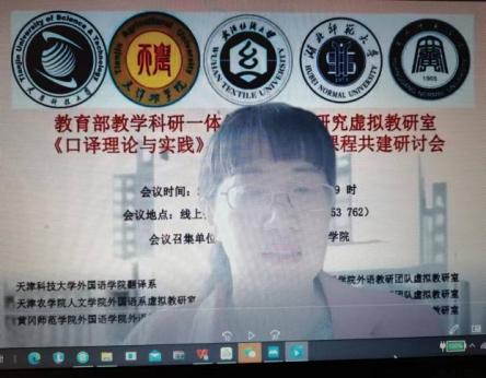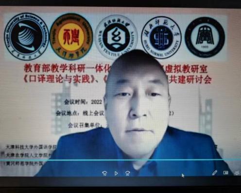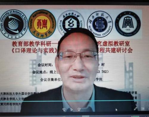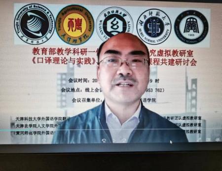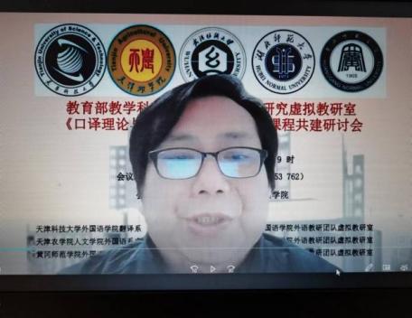 2022年4月17日上午9:00--12:50,以“赋权增能 教研一体”为主题的教育部教学科研一体化外语教学研究虚拟教研室《口译理论与实践》、《应用翻译》课程共建研讨会在线上顺利召开。此次会议由天津科技大学外国语学院召集,天津科技大学外国语学院、天津农学院人文学院、武汉纺织大学外国语学院、湖北师范大学外国语学院、黄冈师范学院外国语学院联合主办。会议由天津科技大学外国语学院副院长江治刚副教授、翻译系副主任孙洪振副教授分段主持。各主办单位全体专业教师参会。