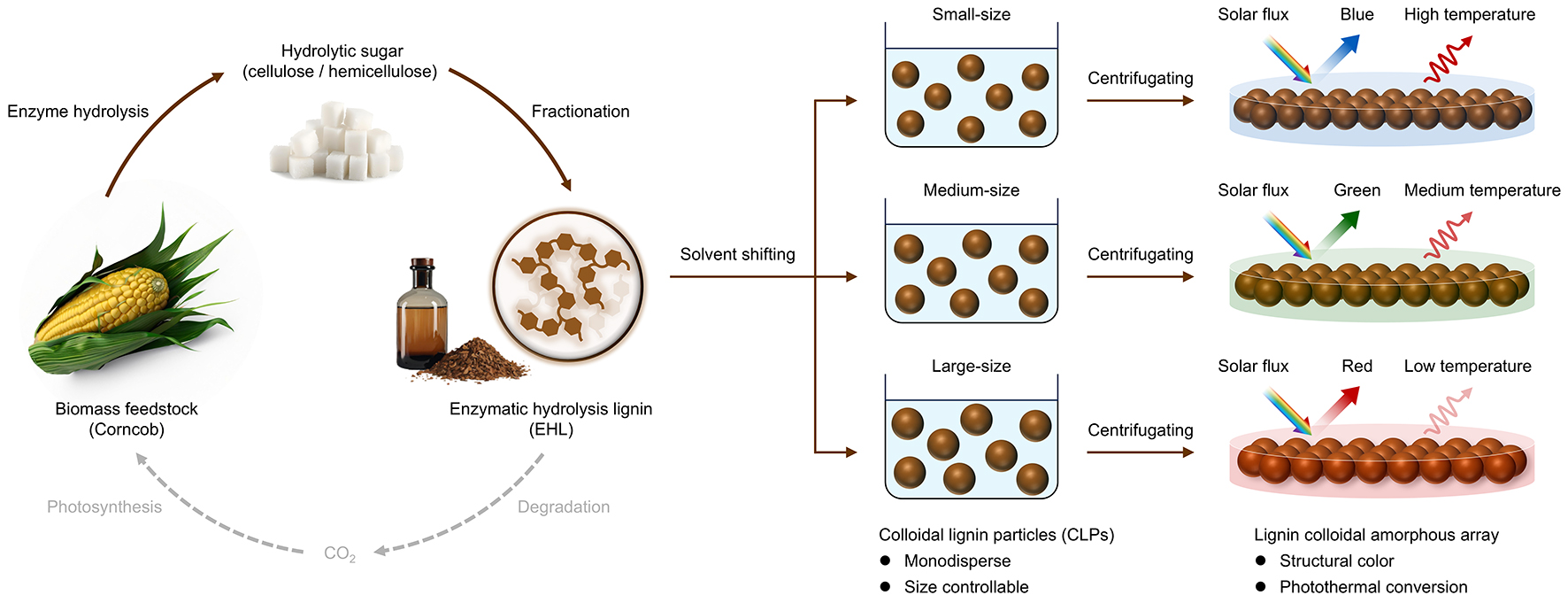 团队以造纸工业木质素为原料,构建了全木质素胶体非晶阵列,系统探讨了胶体颗粒尺寸调控对结构色演变及近红外光热转换性能的影响,揭示了分子尺度π–π堆积与介观光子结构协同增强光–热转化的内在机制,为有机光子材料中光热转换机制的理解及可持续功能材料的设计提供了新的思路(Small 2025, e09559)。