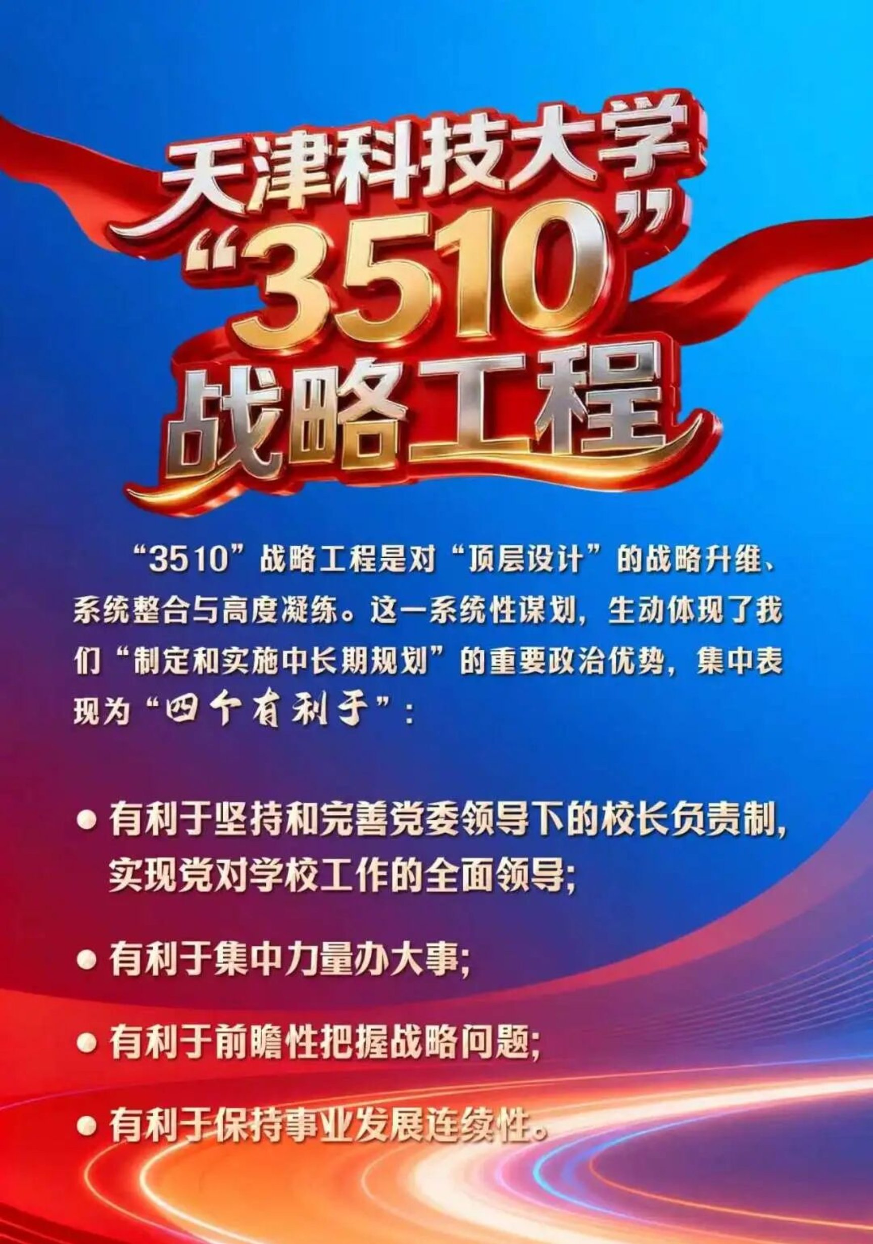 一是要深刻认识实施“3510”战略工程的发展背景、核心内涵和重大意义。要深刻认识实施“3510”战略工程的发展背景和发展自信。全面推进“3510”战略工程,是服务国家战略和区域发展需求的使命担当,是遵循高等教育发展规律的主动选择,是推动学校高质量内涵发展的行动宣言,是凝聚全体师生校友力量的精神旗帜。要准确把握和深刻领会“3510”战略工程的核心内涵和重大意义,准确认识和把握“四个有利于”,从政治高度和战略层面,进一步增强全校上下落实“3510”战略工程的思想自觉、政治自觉和行动自觉。