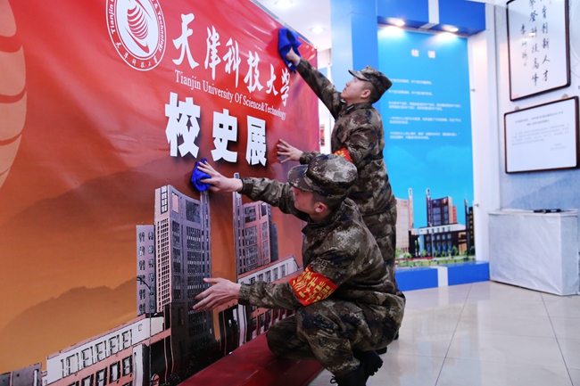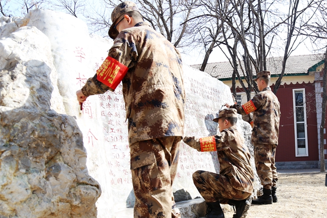 在完成教师办公室、学生实验室等区域的清扫后,5日下午两点,国防生模拟营分组带队前往南北院校门、校史馆、学校简介标识等地,开展公益劳动。国防生自备抹布、扫帚、刷子等清洁工具,边认真清扫,边仔细阅读学校简介和建校发展60年历史,从科大优秀学长的奋斗事迹中汲取新学期军政训练、科学文化学习的精神动力,在校名、校训每一个庄重的文字上感受“尚德尚学尚行 爱国爱校爱人”的科大精神。